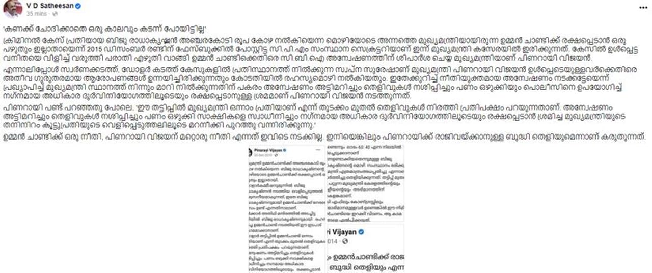 ക്രിമിനല് കേസ് പ്രതിയായ ബിജു രാധാകൃഷ്ണന് അഞ്ചരകോടി രൂപ കോഴ നല്കിയെന്ന മൊഴിയോടെ അന്നത്തെ മുഖ്യമന്ത്രിയായിരുന്ന ഉമ്മന് ചാണ്ടിക്ക് രക്ഷപ്പെടാന് ഒരു പഴുതും ഇല്ലാതായെന്ന് 2015 ഡിസംബര് രണ്ടിന് ഫേസ്ബുക്കില് പോസ്റ്റിട്ട സി.പി.എം സംസ്ഥാന സെക്രട്ടറിയാണ് ഇന്ന് മുഖ്യമന്ത്രി കസേരയില് ഇരിക്കുന്നത്. കേസില് ഉള്പ്പെട്ട വനിതയെ വിളിച്ച് വരുത്തി പരാതി എഴുതി വാങ്ങി ഉമ്മന് ചാണ്ടിക്കെതിരെ സി.ബി.ഐ അന്വേഷണത്തിന് ശിപാര്ശ ചെയ്ത മുഖ്യമന്ത്രിയാണ് പിണറായി വിജയന്.