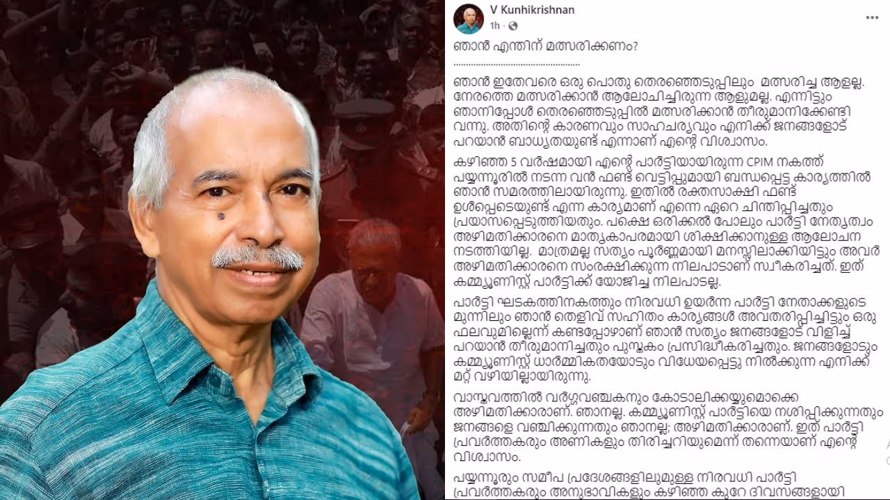 ഞാൻ ഇതേവരെ ഒരു പൊതു തെരഞ്ഞെടുപ്പിലും മത്സരിച്ച ആളല്ല. നേരത്തെ മത്സരിക്കാൻ ആലോചിച്ചിരുന്ന ആളുമല്ല. എന്നിട്ടും ഞാനിപ്പോൾ തെരഞ്ഞെടുപ്പിൽ മത്സരിക്കാൻ തീരുമാനിക്കേണ്ടി വന്നു. അതിൻ്റെ കാരണങ്ങൾ ജനങ്ങളോട് പറയാണ് എനിക്ക് ബാധ്യതയുണ്ടെന്ന് പറഞ്ഞാണ് അദ്ദേഹം തൻ്റെ ഫേസ്ബുക്ക് പോസ്റ്റ് ആരംഭിക്കുന്നത്. കഴിഞ്ഞ 5 വർഷമായി സിപിഎമ്മിനകത്ത് പയ്യന്നൂരിൽ നടന്ന വൻ ഫണ്ട് വെട്ടിപ്പുമായി ബന്ധപ്പെട്ട കാര്യത്തിൽ സമരത്തിലായിരുന്നു എന്ന് അദ്ദേഹം പറയുന്നു. രക്തസാക്ഷി ഫണ്ട് ഉൾപ്പെടെയുണ്ട് എന്ന കാര്യമാണ് തന്നെ ഏറെ ചിന്തിപ്പിച്ചതും പ്രയാസപ്പെടുത്തിയതും. പക്ഷെ ഒരിക്കൽ പോലും പാർട്ടി നേതൃത്വം അഴിമതിക്കാരനെ മാതൃകാപരമായി ശിക്ഷിക്കാനുള്ള ആലോചന നടത്തിയില്ല. മാത്രമല്ല സത്യം പൂർണ്ണമായി മനസ്സിലാക്കിയിട്ടും അവർ അഴിമതിക്കാരനെ സംരക്ഷിക്കുന്ന നിലപാടാണ് സ്വീകരിച്ചത്. ഇത് കമ്മ്യൂണിസ്റ്റ് പാർട്ടിക്ക് യോജിച്ച നിലപാടല്ല എന്നും വി കുഞ്ഞികൃഷ്ണൻ പറയുന്നു.