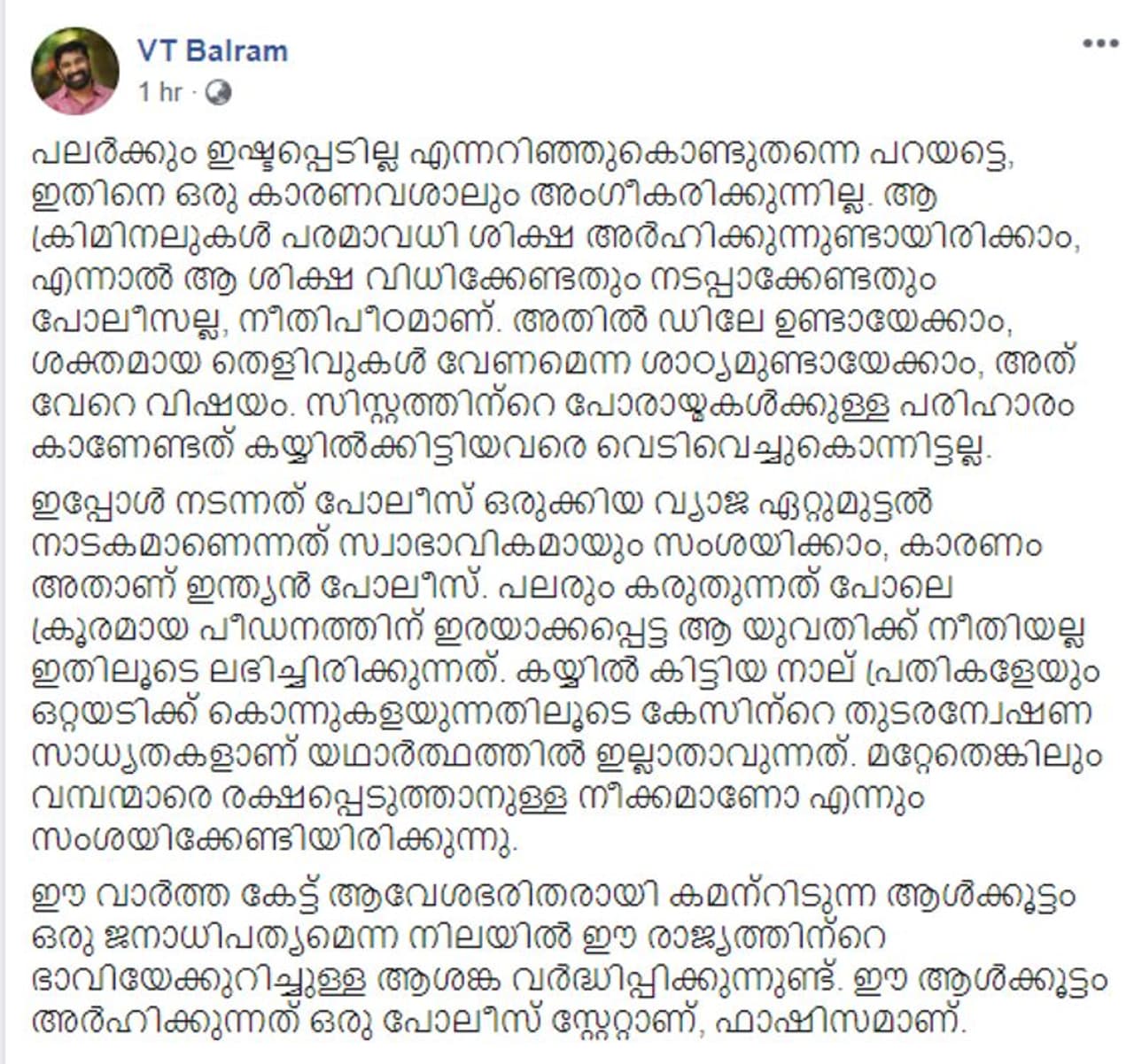 ആ ക്രിമിനലുകള് പരമാവധി ശിക്ഷ അര്ഹിക്കുന്നുണ്ടായിരിക്കാം. എന്നാല്, ആ ശിക്ഷ വിധിക്കേണ്ടതും നടപ്പാക്കേണ്ടതും പൊലീസല്ല, നീതിപീഠമാണ്.