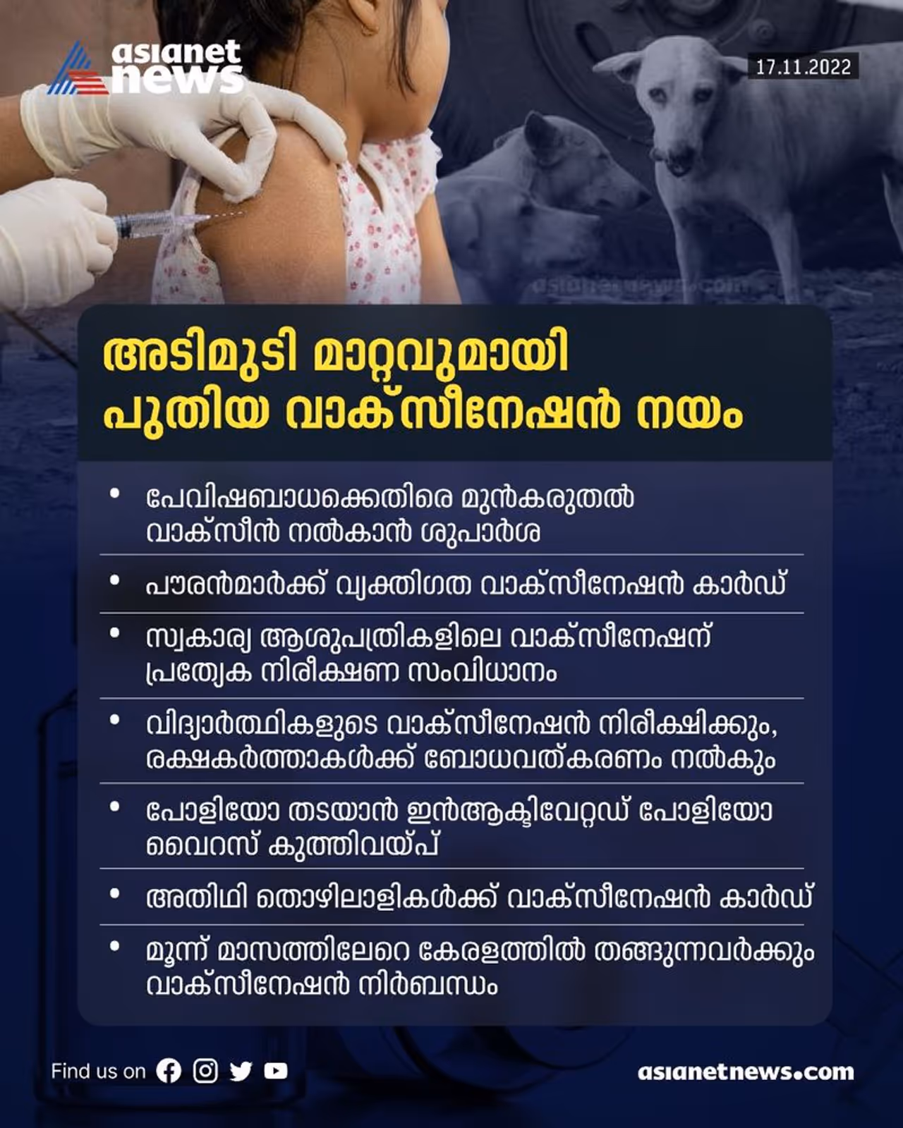 പേവിഷ ബാധക്ക് എതിരായ പ്രീ-എക്സ്പോഷർ വാക്സീനേഷൻ , വ്യക്തിഗത വാക്സിനേഷൻ കാര്ഡ്, സ്വകാര്യ മേഖലയിലെ വാക്സീനേഷൻ വിശദാംശങ്ങൾ സര്ക്കാര് തലത്തിൽ ശേഖരിക്കുക തുടങ്ങി വിദഗ്ധ സമിതിയുടെ നിര്ദേശങ്ങൾ വൻ മാറ്റങ്ങൾക്ക് തുടക്കമിടുമെന്നാണ് ആരോഗ്യ രംഗത്തെ വിദഗ്ധര് പറയുന്നത്. വാക്സീൻ സ്വീകരിക്കുന്നതിലടക്കം ഇപ്പോഴും ചിലയിടങ്ങളിലെങ്കിലും നിലവിലുള്ള അബദ്ധ ധാരണകൾ മാറ്റാൻ അവബോധ പരിപാടികൾ കൂടി ശക്തമാക്കണമെന്ന ആവശ്യവും ഉയര്ന്നിട്ടുണ്ട്