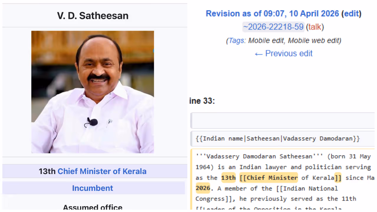 തിരുവനന്തപുരം: നിയമസഭ തെരഞ്ഞെടുപ്പ് വോട്ടിംഗ് പൂര്ത്തിയായതിന് പിന്നാലെ പ്രതിപക്ഷ നേതാവ് വി ഡി സതീശന്റെ വിക്കിപീഡിയ പേജ് ആരോ എഡിറ്റ് ചെയ്തു. വി ഡി സതീശനെ കേരളത്തിന്റെ 13-ാം മുഖ്യമന്ത്രിയാക്കി കൊണ്ടായിരിരുന്നു ആദ്യ എഡിറ്റിംഗ്. 2026 മേയ് നാലിന് ചുമതലയേറ്റതെന്നും എഡിറ്റ് ഹിസ്റ്ററിയിൽ നിന്നുള്ള വിവരങ്ങൾ വ്യക്തമാക്കുന്നു. പിന്നാലെ അദ്ദേഹത്തിന്റെ പേജിൽ വീണ്ടും എഡിറ്റിംഗ് ചെയ്തിട്ടുണ്ട്. ഇപ്പോൾ പരിശോധിച്ചാൽ വി ഡി സതീശൻ പ്രതിപക്ഷ നേതാവ് എന്നാണ് രേഖപ്പെടുത്തിയിട്ടുള്ളത്. പക്ഷേ ചുമതയേറ്റ ദിനം 2026 മേയ് നാല് എന്ന് തന്നെയാണുള്ളത്.