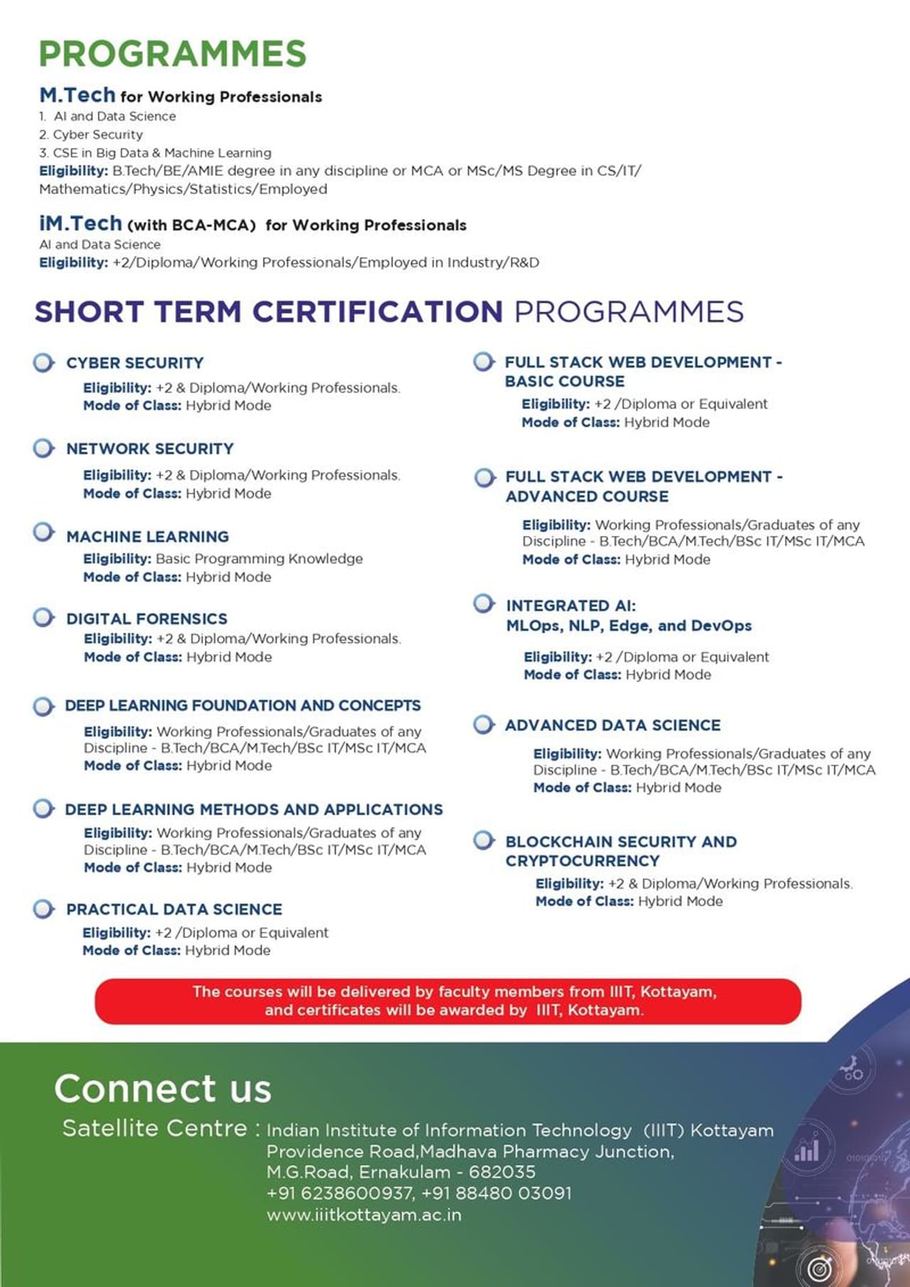 വർക്കിങ് പ്രൊഫഷണലുകൾക്കും പ്ലസ് ടു പൂർത്തിയാക്കിയ വിദ്യാർത്ഥികൾക്കും യോജിച്ച ഏതാനും കോഴ്സുകളാണ് ഐഐഐടി കോട്ടയം അവതരിപ്പിക്കുന്നത്. കൊച്ചി മാധവ ഫാർമസി ജംക്ഷനിലെ വിദ്യാനികേതൻ ക്യാംപസിൽ പുതിയ സാറ്റലൈറ്റ് സെന്റർ ഇതിനായി ഐഐഐടി ആരംഭിച്ചു.