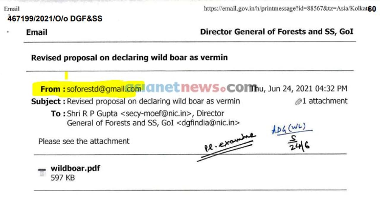 2021 ഫെബ്രുവരി 19 -നു കേരള സര്ക്കാര് പുറത്തിറിക്കിയ ഉത്തരവ് പ്രകാരം എല്ലാ സര്ക്കാര് ഉദ്യോഗസ്ഥരും ഔദ്യോഗിക കൃത്യ നിര്വഹണത്തിന് gov.in എന്ന എക്സ്റ്റന്ഷന് ഉള്ള സര്ക്കാര് ഇമെയില് ഐഡികള് മാത്രമേ ഉപയോഗിക്കാന് പാടുള്ളൂ. ഈ നിയമം നിലനില്ക്കെയാണ് സംസ്ഥാന വനം പ്രിന്സിപ്പല് സെക്രട്ടറി മറ്റൊരു സ്വകാര്യ ഐഡി ഔദ്യോഗിക കൃത്യനിര്വഹണത്തിന് ഉപയോഗിച്ചത്. കാട്ടുപന്നിയെ ക്ഷുദ്ര ജീവിയായി പ്രഖ്യാപിക്കുന്ന കാര്യത്തില് വനം വകുപ്പ് നടത്തുന്ന ഈ നീക്കങ്ങള് ജനങ്ങളെ കബളിപ്പിക്കുന്നതാണെന്നും കിഫ ചെയര്മാന് അലക്സ് ഒഴുകയില് പറഞ്ഞു.