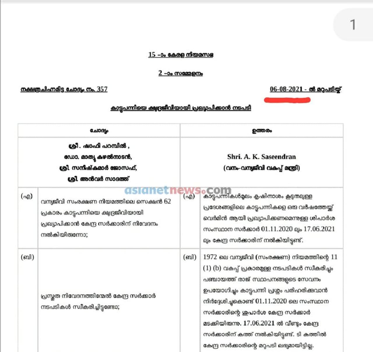 ഓഗസ്റ്റ് 6 -ാം തിയത 15 -ാം നിയമസഭയുടെ രണ്ടാം സമ്മേളനത്തിലാണ് ഈ വിഷയത്തില് എംഎല്എമാരുടെ ചോദ്യം ഉയര്ന്നത്. വന്യജീവി സംരക്ഷണ നിയമത്തിലെ സെക്ഷന് 62 പ്രകാരം കാട്ടുപന്നിയെ ക്ഷുദ്രജീവിയായി പ്രഖ്യാപിക്കാന് കേന്ദ്ര സര്ക്കാറിന് നിവേദനം നല്കിയിരുന്നോ, പ്രസ്തുത നിവേദനത്തില് കേന്ദ്ര സര്ക്കാര് നടപടികള് സ്വീകരിച്ചിട്ടുണ്ടോ എന്നിവയായിരുന്നു നക്ഷത്രചിഹ്നം ഇട്ട ചോദ്യങ്ങള്.