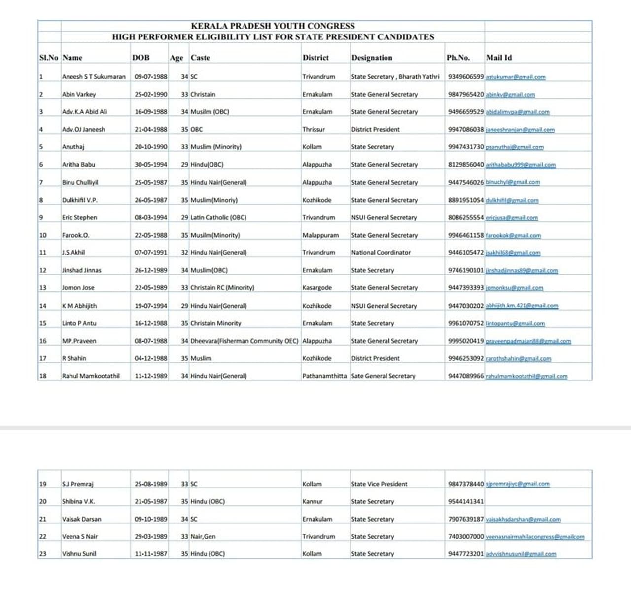 രാഹുൽ മാങ്കൂട്ടത്തിൽ, ജെ എസ് അഖിൽ എന്നിവരടക്കമുള്ള 23 പേരുടെ പട്ടികയാണ് പ്രസിദ്ധീകരിച്ചത്. ഇതുവരെയും സംസ്ഥാന അധ്യക്ഷനെ തെരഞ്ഞെടുക്കുന്ന കാര്യത്തിൽ ഐക്യത്തിലേക്ക് എത്താൻ യൂത്ത് കോൺഗ്രസിന് കഴിഞ്ഞിട്ടില്ല.