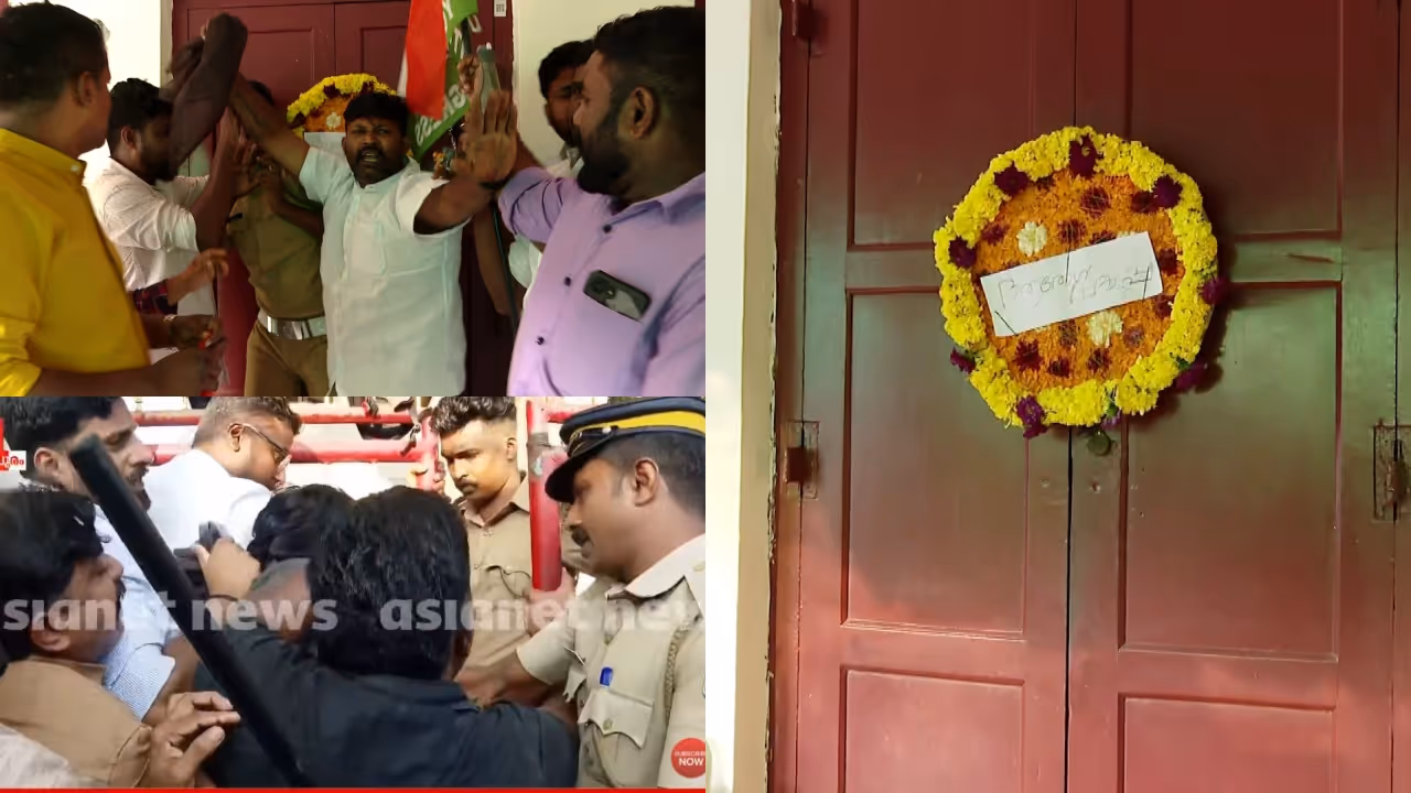 വീണ ജോര്‍ജിന്‍റെ ഔദ്യോഗിക വീടിന് മുന്നില്‍ റീത്തുമായി എത്തിയായിരുന്നു യൂത്ത് കോണ്‍ഗ്രസ് പ്രവര്‍ത്തകരുടെ പ്രതിഷേധം. രാവിലെ 8 മണിയോടെ വീണ ജോര്‍ജിന്‍റെ വീടിന് മുന്നില്‍ പൊലീസിന് മറി കടന്ന് ഇരച്ച് കയറിയ പ്രവര്‍ത്തകര്‍ വീടിന്‍റെ വാതിലില്‍ റീത്ത് വെച്ചു.