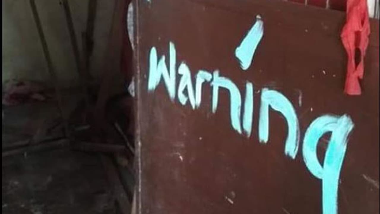 വാതിലിൽ ' വാർണിങ് ' എന്ന് ഇംഗ്ലീഷിൽ നീല പെയിന്‍റ് ഉപയോഗിച്ച് എഴുതി വച്ചിട്ടുണ്ട്.