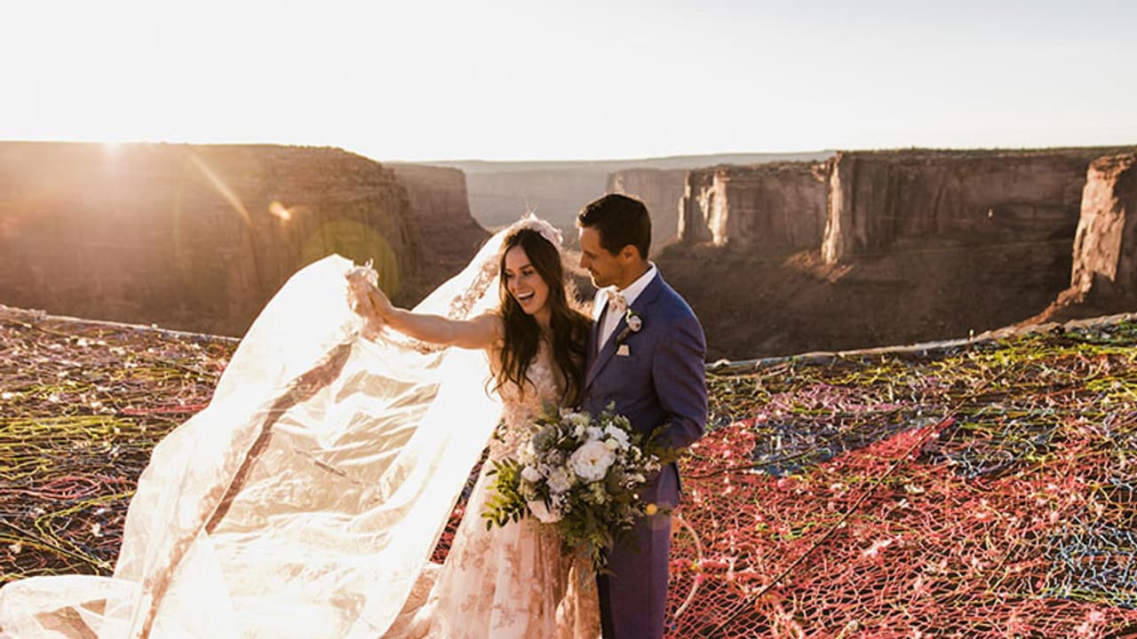 വിവാഹം എവിടെ നടക്കണമെന്നും ചടങ്ങിന് എന്തെല്ലാം പരിപാടികള് എങ്ങനെയെല്ലാം നടക്കണം എന്ന് നീണ്ട ചിന്തകള് നടക്കുമ്പോള് തികച്ചും വ്യത്യസ്തമായ രീതിയില് വിവാഹം നടത്തി വ്യത്യസ്തരാവുകയാണ് ഈ ദമ്പതികള്. വിവാഹശേഷം ഒന്നിച്ചുണ്ടാവുമെന്ന് പ്രതിജ്ഞ ചെയ്യാന് ഈ വധുവരന്മാര് തിരഞ്ഞെടുത്ത സ്ഥമാണ് ഇവരുടെ വിവാഹത്തെ സമൂഹമാധ്യമങ്ങളില് വൈറലാക്കിയത്. കാലിഫോര്ണിയയില് നിന്നുള്ള സാഹസികതയെ ഇഷ്ടപ്പെടുന്ന റയാനും കിമ്പര്ലിയും വിവാഹം ആദ്യം കണ്ടുമുട്ടിയ ഇടത്ത് തന്നെ വിവാഹിതരാകണമെന്ന് ആഗ്രഹിച്ചതോടെയാണ് മോബ് ഗര്ത്തത്തിന് കുറുകെ നിലത്ത് നിന്നും 400 അടി ഉയരത്തില് ഇവര്ക്കായി വിവാഹ വേദിയൊരുങ്ങിയത്.