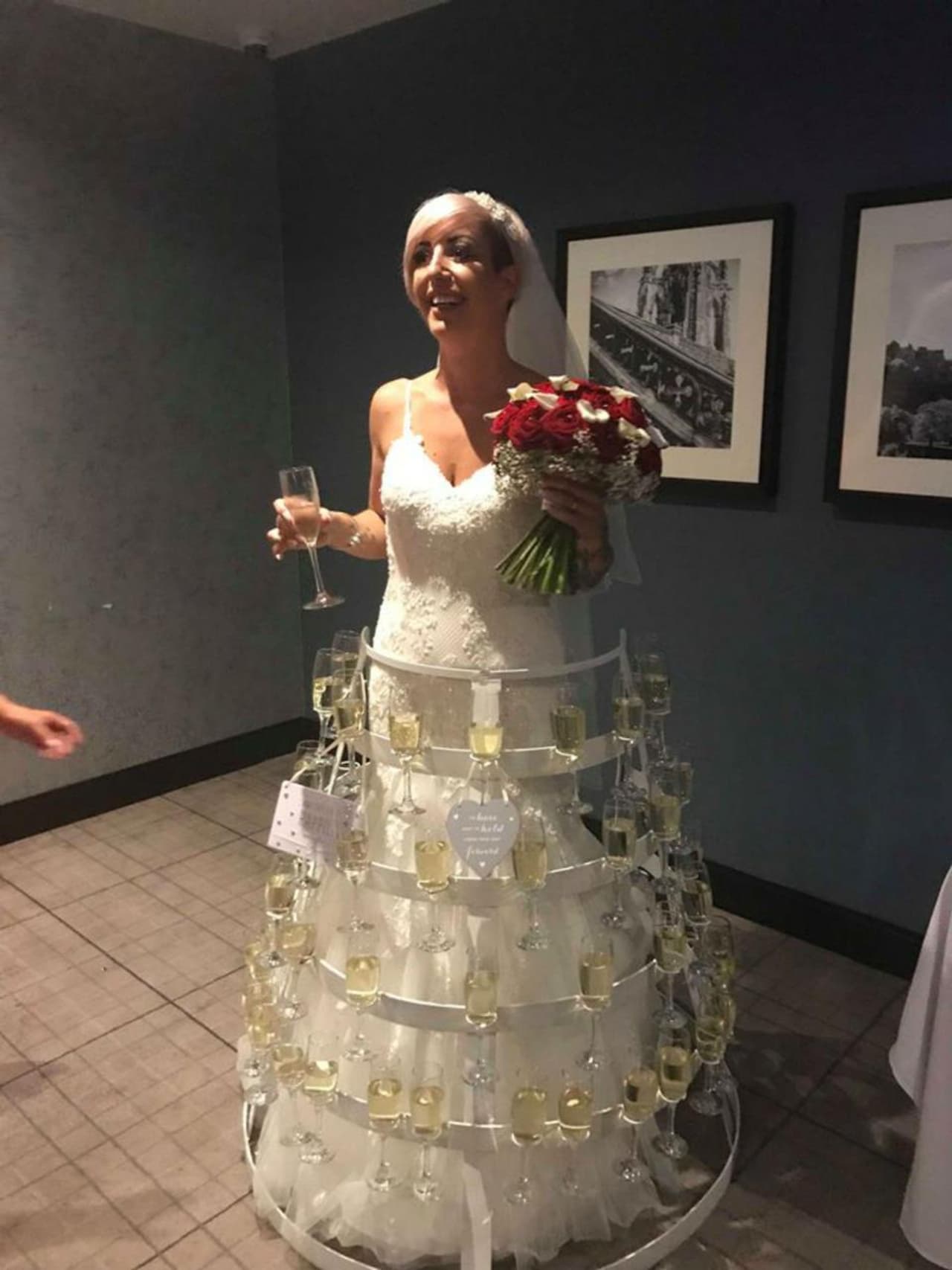 50 ഗ്ലാസുകളില് മദ്യം ഉള്കൊള്ളുന്ന രീതിയിലുള്ള ഡിസൈനുകളിലെ പുത്തന് ഫാഷന് വിവാഹവസ്ത്രമാണ് കെറി മക്മില്ലണ് അണിഞ്ഞത്. സ്റ്റീലുകൊണ്ട് നിര്മ്മിച്ച നാല് നിരയില് 50 ഗ്ലാസുകള് വയ്ക്കാവുന്ന തരത്തിലാണ് വിവാഹ വസ്ത്രം കെറി ഡിസൈന് ചെയ്തിരിക്കുന്നത്. മെറ്റല് ഫ്രെയിം ഉണ്ടാക്കി അതിനകത്ത് വിവാഹ വസ്ത്രവുമായി കയറി നില്ക്കാവുന്ന തരത്തിലാണ് ഇത് നിര്മ്മിച്ചിരിക്കുന്നത്.