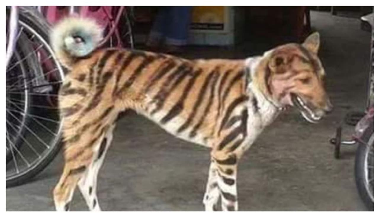 തീര്ത്തഹള്ളി താലൂക്കിലെ നളൂരു ഗ്രാമത്തിലെ കര്ഷകനായ ശ്രീകാന്ത് ഗൗഡയാണ് നായയ്ക്ക് കടവുയുടെ നിറം അടിച്ചത്. കര്ണാടകയിലെ ചില ഗ്രാമങ്ങളില് കൃഷിയിടങ്ങളിലെ ശല്യക്കാരെ തുരത്താനായി കടുവയുടെ പാവ ഉപയോഗിച്ച് കണ്ടിട്ടുണ്ട്. അതുപോലെ ഒരു പാവയെ തന്റെ കൃഷിയിടത്തും വച്ചു. അപ്പോള് കുരങ്ങന്മാരുടെ ശല്യം കുറഞ്ഞു. ഇതാണ് നായയെ കടുവയുടെ നിറം പൂശാന് പ്രേരിപ്പിച്ചതെന്ന് ശ്രീകാന്ത് പറയുന്നു.