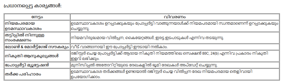 പ്രോപ്പര്ട്ടി രജിസ്ട്രേഷന് നിയമപരമായ ഉടമസ്ഥാവകാശം ഉറപ്പാക്കുന്നു, തട്ടിപ്പുകളില് നിന്ന് സംരക്ഷിക്കുന്നു, കൂടാതെ മോര്ട്ട്ഗേജ് പോലുള്ള സാമ്പത്തിക നേട്ടങ്ങളും നല്കുന്നു.