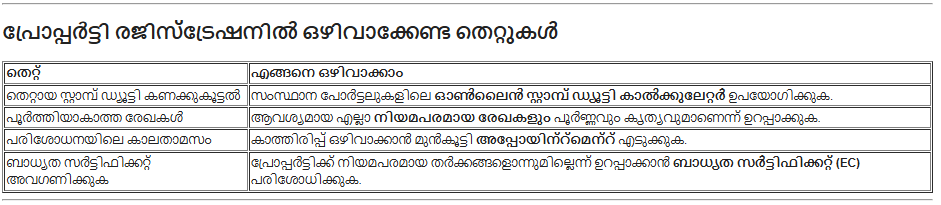 17. പ്രോപ്പര്ട്ടി രജിസ്ട്രേഷനില് ഒഴിവാക്കേണ്ട പൊതുവായ തെറ്റുകള് എന്തൊക്കെയാണ്?