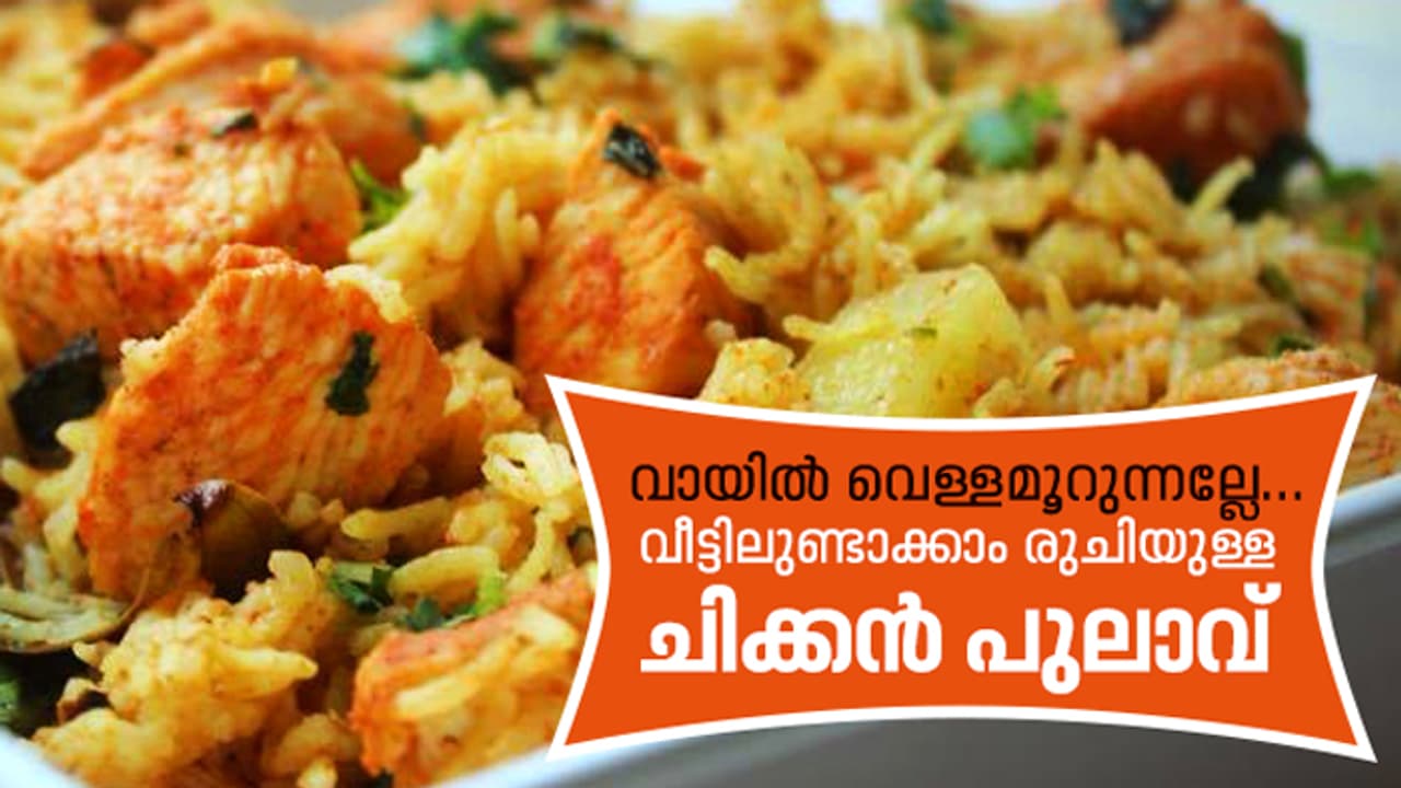വീട്ടിൽ ചിക്കൻ പുലാവ് എന്ന വിഭവം വളരെ രുചിയോടെ ഉണ്ടാക്കാനാകും. വളരെ എളുപ്പം ഉണ്ടാക്കാൻ പറ്റുന്ന ഒന്നാണ് ചിക്കൻ പുലാവ്. കുട്ടികൾക്ക് ഏറെ ഇഷ്ടപ്പെടുന്ന വിഭവങ്ങളിലൊന്നാണ് ചിക്കൻ പുലാവ്. സ്വാദുള്ള ചിക്കൻ പുലാവ് വീട്ടിലുണ്ടാക്കുന്നത് എങ്ങനെയെന്ന് നോക്കാം.