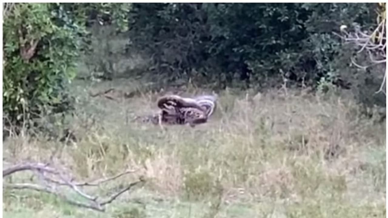 വിനോദ സഞ്ചാരികളാണ് ദൃശ്യങ്ങള് പകര്ത്തിയത്. പെരുമ്പാമ്പാണ് ആക്രമണത്തിന് തുടക്കമിട്ടത്. ഇരുവരും മുഖത്തോട് മുഖം കണ്ടപ്പോള് പുള്ളിപ്പുലിയെ ആക്രമിക്കാന് പെരുമ്പാമ്പ് തുനിഞ്ഞു. പുള്ളിപ്പുലിയുടെ ശരീരത്തിലേക്ക് ചാടിയ പെരുമ്പാമ്പ് ചുറ്റിവരിയാന് ശ്രമിച്ചു. എന്നാല്, ചുറ്റിവരിയുന്നതിനിടെ തലയില് കടിച്ച പുള്ളിപ്പുലി, പെരുമ്പാമ്പിന്റെ പിടിത്തത്തില്നിന്ന് രക്ഷപ്പെട്ടു.