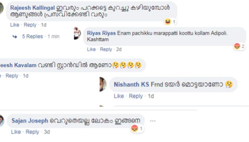 വെറുതെയല്ല ലോകം ഇങ്ങനെയെന്നും, ഈനാംപേച്ചിക്ക് മരപ്പട്ടി കൂട്ടെന്നും, ടയര് മൊട്ടയാണോ, വണ്ടി സ്റ്റാന്ഡിലാണോയെന്നുമൊക്കെയുള്ള കമന്റുകള് ഏറെ വന്നു. അല്പം കടന്ന് 'പ്രസവം വരെ ഇനി ആണുങ്ങള് ചെയ്യേണ്ടിവരു'മെന്ന തരത്തിലും കമന്റുകള് കടുത്തു