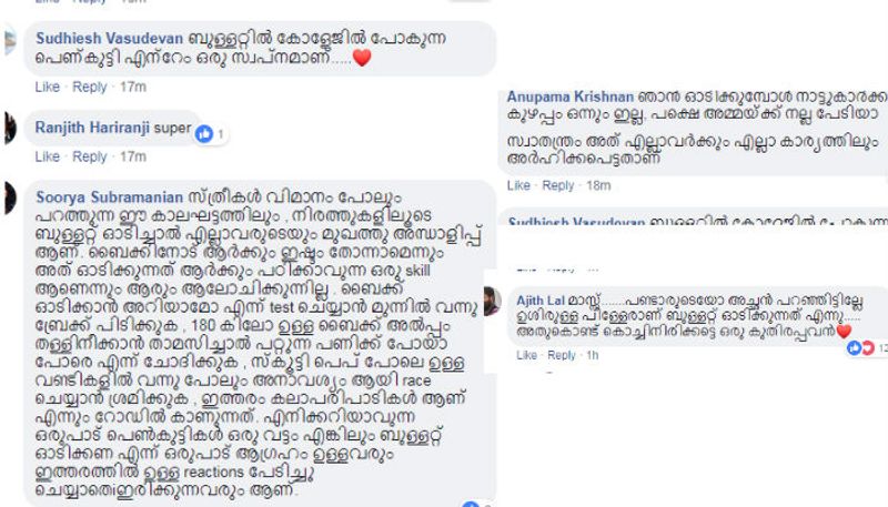 വണ്ടിയോടിക്കുന്ന സ്ത്രീകള് സ്വന്തം അനുഭവങ്ങള് ചേര്ത്തെഴുതിയും പെണ്കുട്ടിക്ക് പിന്തുണ പ്രഖ്യാപിച്ചു. വിമര്ശകരുടെ കടന്നാക്രമണങ്ങള് നിഷ്പ്രഭമാക്കിക്കൊണ്ട് 'ബുള്ളറ്റോടിക്കുന്ന പെണ്കുട്ടി' പിന്നെയും പേജുകളില് നിന്ന് പേജുകളിലേക്കും വാളുകളില് നിന്ന് വാളുകളിലേക്കും ഓടിക്കൊണ്ടിരിക്കുകയാണിപ്പോള്.
