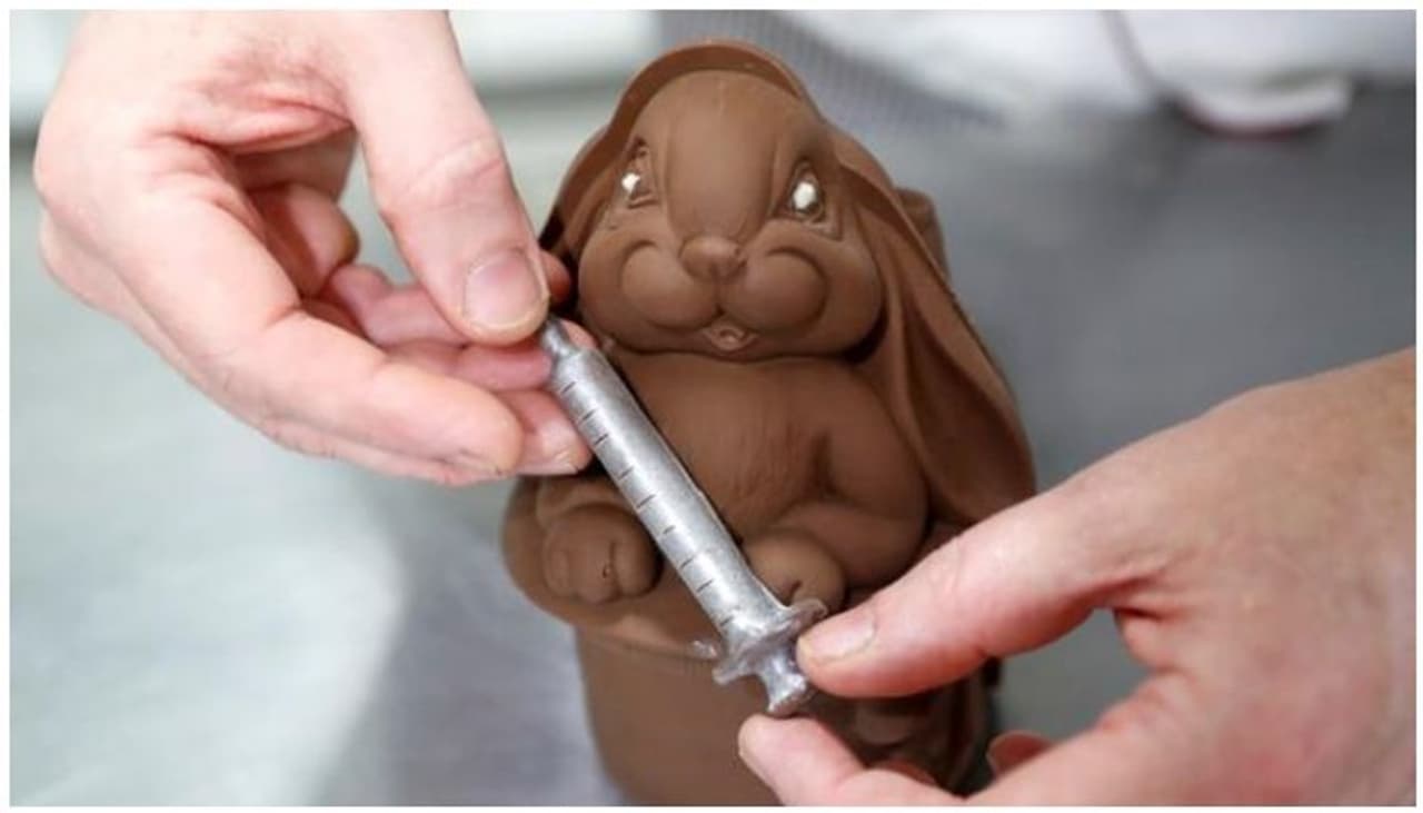 സിറിഞ്ച് പിടിച്ച് നില്ക്കുന്ന ചോക്ലേറ്റ് മുയലച്ചന്മാരുടെ ചിത്രങ്ങളാണ് ഇപ്പോൾ സോഷ്യൽ മീഡിയയിൽ വെെറലാകുന്നത്. പ്രമുഖ ഹംഗേറിയന് ഷെഫായ ലാസ്ലോ റിമോസിയാണ് ഈ ചോക്ലേറ്റ് മുയലച്ചന്മാരെ ഒരുക്കിയിരിക്കുന്നത്.