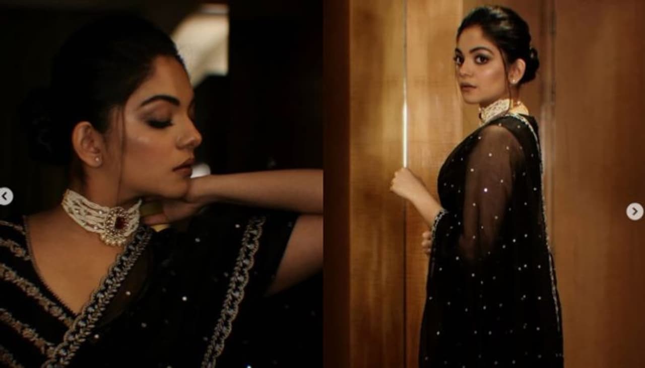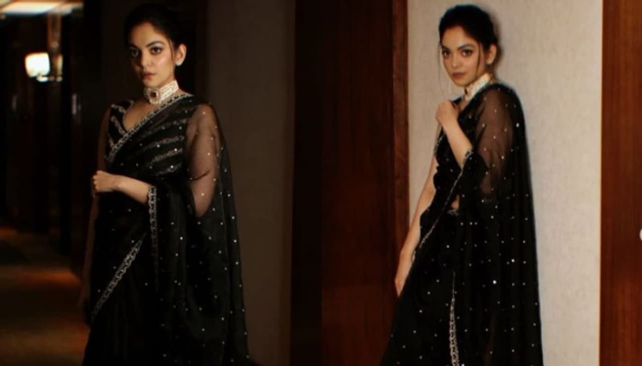 zuleiha by shehazeen ആണ് അഹാനയ്ക്ക് വേണ്ടി സാരി ഡിസൈന് ചെയ്തത്. കറുപ്പില് ചെറിയ വര്ക്ക് വരുന്നെ നെറ്റ് മെറ്റീരിയലിലുള്ളതാണ് സാരി. അതിനോടൊപ്പം ഹെവി ചോക്കറാണ് അഹാന ധരിച്ചിരിക്കുന്നത്. തലമുടി പുറകിലോട്ട് കെട്ടിവെയ്ക്കുക കൂടി ചെയ്തപ്പോള് താരത്തിന്റെ ലുക്ക് കംപ്ലീറ്റായി. ജെമുന ദേവരാജ് ആണ് ഹെയര് ചെയ്തത്.