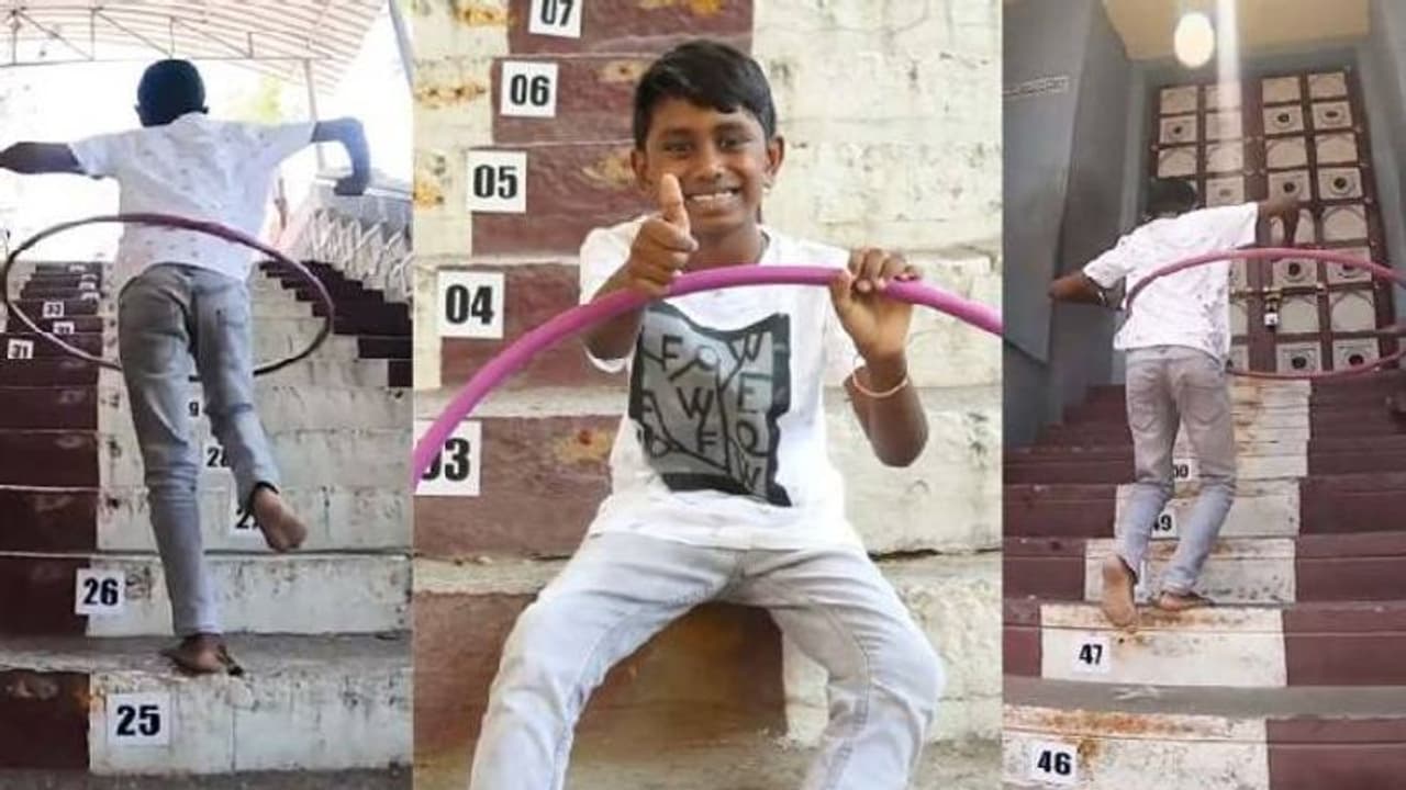 ഹൂലാഹൂപ്പിങ് ചെയ്തുകൊണ്ട് പടിക്കെട്ടുകൾ ഓടിക്കയറി ഗിന്നസ് റെക്കോർഡ് സ്വന്തമാക്കിയിരിക്കുകയാണ് ഒരു ബാലൻ. ചെന്നൈ സ്വദേശിയായ ആധവ് സുകുമാർ 19 സെക്കൻഡിൽ താഴെ മാത്രം സമയമെടുത്താണ് ഹൂലാഹൂപ്പിങ് ചെയ്തുകൊണ്ട് അമ്പത് പടവുകൾ ഓടിക്കയറിയത്.