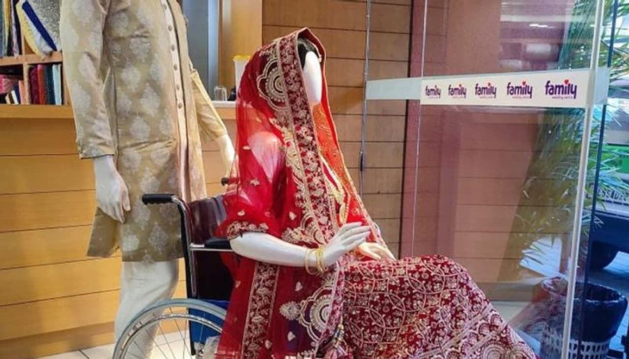 പദ്ധതിയുടെ ഉദ്ഘാടനദിവസം ടെക്സ്റ്റെയില്സുകാര് ചെയ്ത മറ്റൊരു ചുവടുവയ്പാണ് അതിലുമേറെ ശ്രദ്ധിക്കപ്പെട്ടിരിക്കുന്നത്. സാധാരണഗതിയില് ടെക്സ്റ്റെയില്സ് ഷോപ്പുകളില് വസ്ത്രങ്ങള് ഡിസ്പ്ലേ ചെയ്യുന്നതിനായി പുരുഷന്മാരുടെയും സ്ത്രീകളുടെയും കുട്ടികളുടെയുമെല്ലാം ഡമ്മികളുപയോഗിക്കാറുണ്ടല്ലോ. എന്നാല് തീര്ത്തും 'നോര്മല്' ആയ മനുഷ്യരൂപങ്ങളാണ് ഇത്തരത്തില് ഡമ്മികളായി വരാറ്. അതേസമയം ഈ കടയില് വീല്ചെയറിലിരിക്കുന്ന വധുവിന്റെ രൂപമാണ് ഇവര് ഡിസ്പ്ലേ ചെയ്തത്.