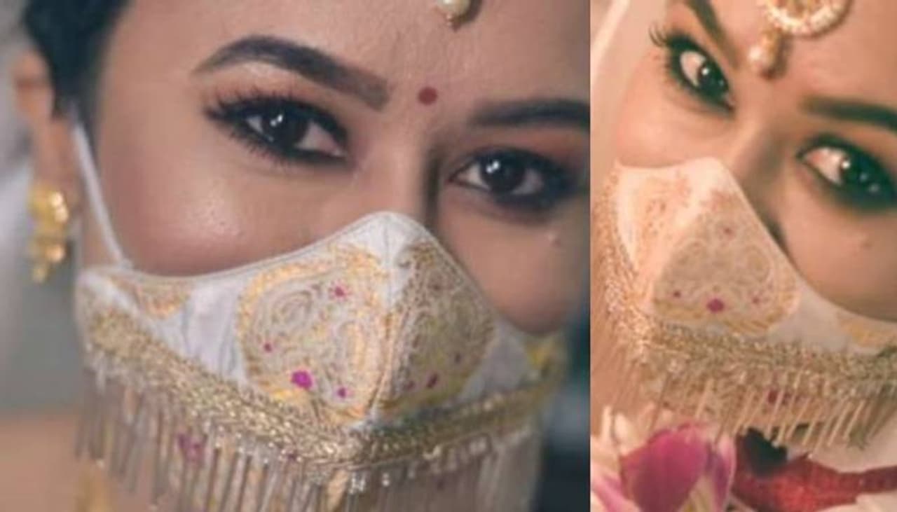 വിവാഹത്തിനു വേണ്ടി പ്രത്യേകം നിര്മിച്ചൊരു സില്ക് മാസ്ക് ആണിത്. വധുവിന്റെയും വരന്റെയും വസ്ത്രത്തോട് ചേര്ന്നുനില്ക്കുന്ന ഡിസൈനാണ് ഈ മാസ്കിന്റെ പ്രത്യേകത. തിളങ്ങുന്ന പട്ടു കൊണ്ടുള്ള മാസ്ക് ആണ് വധുവിന്റേത്.