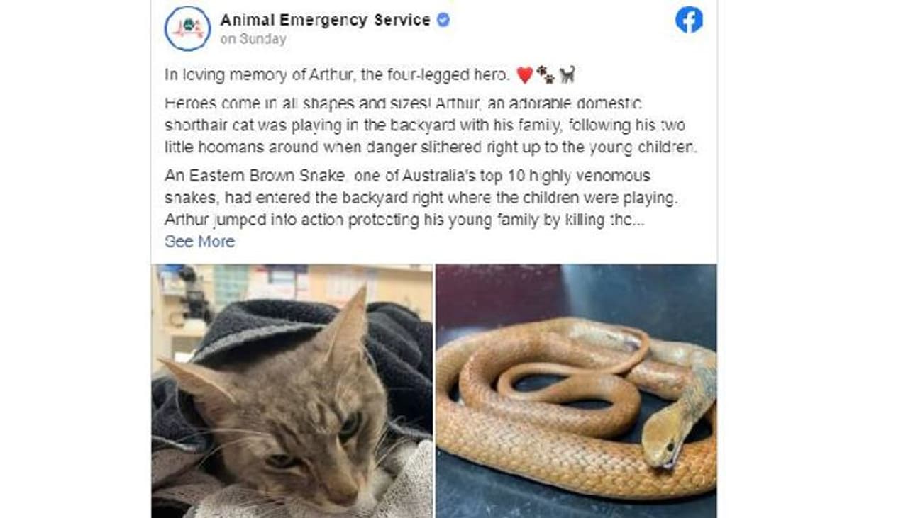 ഓസ്ട്രേലിയയിലെ ക്വീൻസ്ലൻഡിൽ വീട്ടുമുറ്റത്ത് കളിച്ചുകൊണ്ടിരിക്കുകയായിരുന്ന രണ്ട് കുട്ടികളെ ഉഗ്ര വിഷമുള്ള പാമ്പിന്റെ പിടിയില് നിന്ന് സ്വന്തം ജീവൻ ത്യജിച്ച് രക്ഷിച്ചിരിക്കുകയായിരുന്നു ഇവരുടെ വളർത്തുപൂച്ചയായ ആർതർ. അപകടകാരിയായ 'ഈസ്റ്റേൺ ബ്രൗൺ' ഇനത്തിൽപ്പെട്ട പാമ്പിന്റെ ആക്രമണത്തിൽ നിന്നുമാണ് പൂച്ച കുട്ടികളെ രക്ഷിച്ചത്.