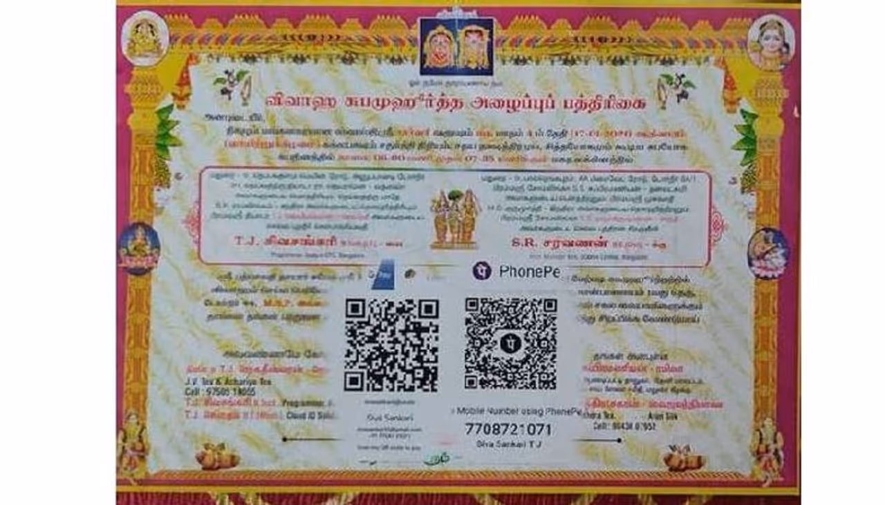 ഗൂഗിൾ പേ, ഫോൺ പേ എന്നിവയുടെ ക്യൂ ആർ കോഡാണ് വിവാഹക്ഷണക്കത്തിൽ പ്രിന്റ് ചെയ്തിരിക്കുന്നത്. വിവാഹത്തിന് ക്ഷണിച്ചവരിൽ മുപ്പതോളം പേർ പുതിയ സൗകര്യം ഉപയോഗപ്പെടുത്തിയെന്നാണ് വധുവിന്റെ അമ്മ തന്നെ സാക്ഷ്യപ്പെടുത്തുന്നത്. ഞായറാഴ്ച്ചയായിരുന്നു വിവാഹം. ക്ഷണക്കത്ത് സോഷ്യല് മീഡിയയില് വൈറലായതിന് പിന്നാലെ നിരവധി ഫോൺ കോളുകളും അന്വേഷണങ്ങളും ഉണ്ടായതായി വധുവിന്റെ അമ്മ മാധ്യമങ്ങളോട് പറഞ്ഞു.