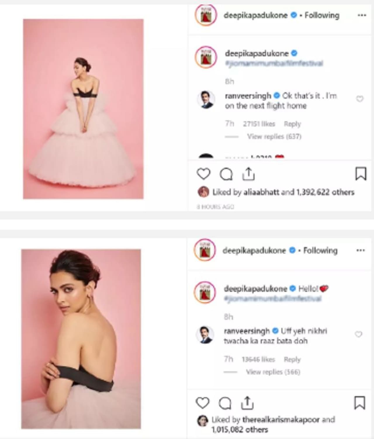 കഴിഞ്ഞ ദിവസം ദീപിക തന്നെയാണ് മൂന്ന് ചിത്രങ്ങള് തന്റെ ഇന്സ്റ്റഗ്രാമില് പങ്കുവെച്ചത്. അതിന്റെ താഴെയാണ് രണ്വീര് കമന്റ് ചെയ്തത്. അടുത്ത ഫ്ലൈറ്റില് വീട്ടിലേക്ക് വരുന്നുവെന്നാണ് രണ്വീര് കമന്റ് ചെയ്തത്.