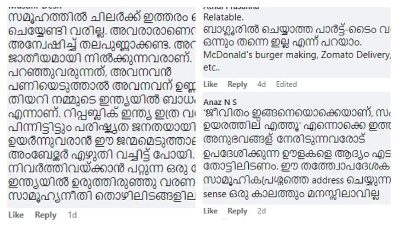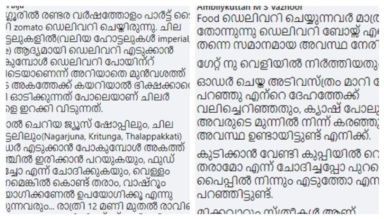 ഒരു ഹോട്ടലിൽ പോയി ഫുഡ് കഴിക്കാനിരിക്കുമ്പോള് ഡെലിവറി യൂണിഫോമിട്ടിരുന്ന എന്നെ നോക്കി ഇവർക്ക് ഇവിടിരുത്തി ആരാണ് ഫുഡ് കൊടുത്തത് എന്ന ചോദ്യം കേട്ട് ആകെ ചൂളിയില്ലാണ്ടായി പോയ എന്നെ വേറാരും ഈ അവസ്ഥയിൽ കാണരുതേ എന്നു പ്രാർത്ഥിച്ചിരുന്നു. എനിക്ക് മാത്രമല്ല ഇത്തരം അനുഭവങ്ങൾ നേരിട്ടട്ടുള്ളതെന്ന് ഈയടുത്ത് ഒരു സുഹ്യത്തിനോട് സംസാരിക്കുമ്പോ മനസ്സിലായി.