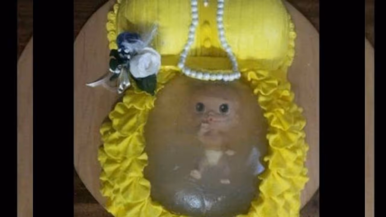 ഭ്രൂണത്തിനുള്ളളിൽ കണ്ണ് തുറന്നിരുന്ന കുഞ്ഞ് ഡയഫർ ധരിച്ചാണ് കിടപ്പ്. മഞ്ഞ നിറത്തിലുള്ള ക്രീും വെള്ള നിറത്തിലുള്ള മുത്തും ഉപയോഗിച്ചാണ് കേക്ക് തയ്യാറാക്കിയിരിക്കുന്നത്.