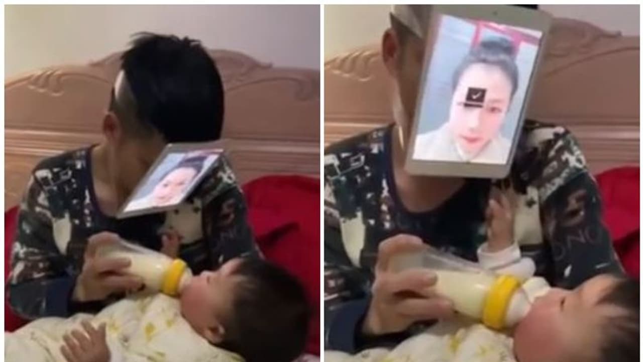 ടാബ്ലെറ്റില് ഭാര്യയുടെ ചിത്രം തുറന്ന ശേഷം ടാബ്ലെറ്റ് ടേപ്പ് ഉപയോഗിച്ച് മുഖത്ത് ഒട്ടിച്ചു. ഇതിനു ശേഷം കുഞ്ഞിനെ മടിയിലിരുത്തി പാല്ക്കുപ്പി വഴി പാല് നല്കാനും തുടങ്ങി. ടാബിലെ അമ്മയുടെ ചിത്രം കുഞ്ഞ് സൂക്ഷ്മമമായി നോക്കുന്നത് ദൃശ്യങ്ങളിൽ കാണാം.