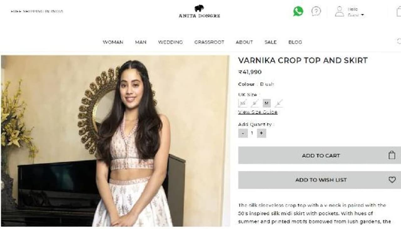 ഫാഷന് ഡിസൈനറായ അനിത ഡോംഗ്രെ ആണ് ഈ വസ്ത്രം ഡിസൈന് ചെയ്തത്. വൈറ്റ് ക്രോപ്പ് ടോപ്പിനോടൊപ്പം ഫ്ലോറാല് സ്കേര്ട്ടാണ് പെയര് ചെയ്തിരിക്കുന്നത്. വി നെക്കും സ്ലീവ് ലെസുമാണ് ടോപ്പിന്റെ പ്രത്യേകതകള്. ഏകദേശം 42,000 രൂപ ആണ് ഈ വസ്ത്രത്തിന്റെ വില.