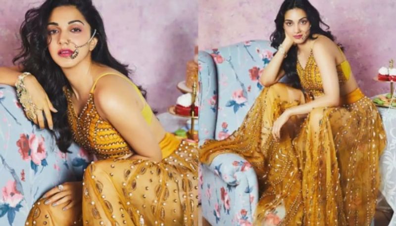 സ്വര്ണ്ണ നിറത്തിലുളള ലഹങ്കയില് അതീവസുന്ദരിയായ കിയാരയെ നമ്മുക്ക് കാണാം. ശിവന് , നരേഷ് എന്നിവര് ഡിസൈന് ചെയ്ത വസ്ത്രങ്ങളാണ് ഫോട്ടോഷൂട്ടിനായി കിയാര ധരിച്ചത്.