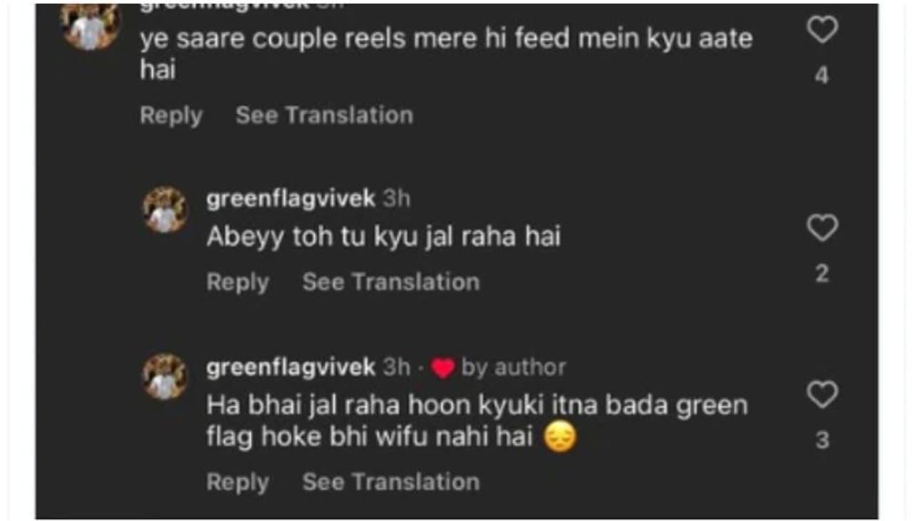 ഗ്രീൻഫ്ളാഗ് വിവേക് എന്നാണ് യുവാവിന്റെ പ്രൊഫൈല് ഐഡിയുടെ പേര്. ഇദ്ദേഹം സ്വയം തന്നെ കമന്റുകളിലൂടെ സംഭാഷണം നടത്തിയത് നിരവധി പേരെയാണ് ആകര്ഷിച്ചത്. ഗ്രീൻ ഫ്ളാഗ് എന്നാല് പെണ്കുട്ടികള്ക്ക് 'ഓക്കെ' ആകുന്ന ടൈപ്പ് ആണുങ്ങളെ വിശേഷിപ്പിക്കുന്നൊരു പ്രയോഗം ആണ്. ഇങ്ങനെ ആയിട്ട് പോലും തനിക്ക് പങ്കാളിയെ കിട്ടുന്നില്ലെന്ന ദുഖമാണ് 'വിവേക്' പങ്കുവയ്ക്കുന്നത്.