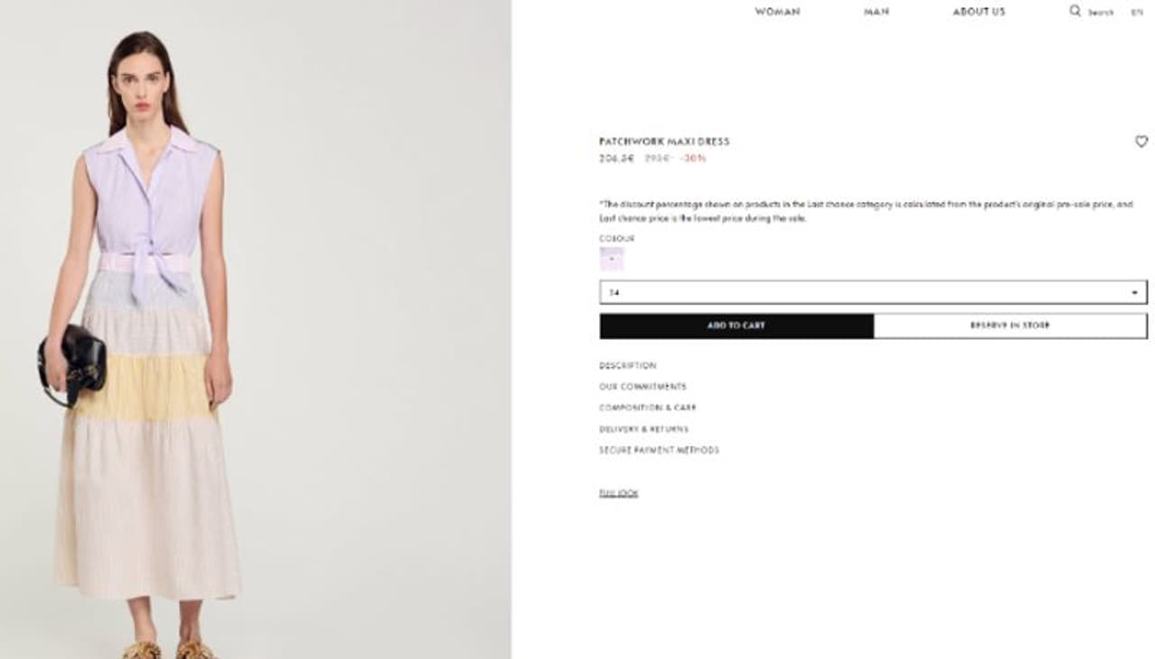 പാച്ച്വര്ക്ക് മാക്സി ഡ്രസ് എന്നതാണ് ഇതിനെ അറിയപ്പെടുന്നത്. സാന്ദ്രോ പാരീസിന്റെ റെഡി ടു വെയര് കളക്ഷനിലുള്ളതാണ് ഈ വസ്ത്രം. ഏകദേശം 18,675 രൂപ (206.5 യൂറോ)യാണ് ഇതിന്റെ വില. പര്പിള്, പിങ്ക്, മഞ്ഞ, നീല എന്നീ നിറങ്ങളാണ് രാധികയുടെ വസ്ത്രത്തിലുള്ളത്. ഷര്ട്ട്-സ്റ്റൈല് കോളര് നെക്ലൈന്, പിന്സ്രൈപ് പാറ്റേണ്സ്, ഫ്ളെയേഡ് ടയേഡ് സ്കേട്ട്, ഇലാക്സ്റ്റിക്കേറ്റഡ് വെയ്റ്റ് എന്നിവയാണ് വസ്ത്രത്തിന്റെ ഡിസൈനിലുള്ളത്.