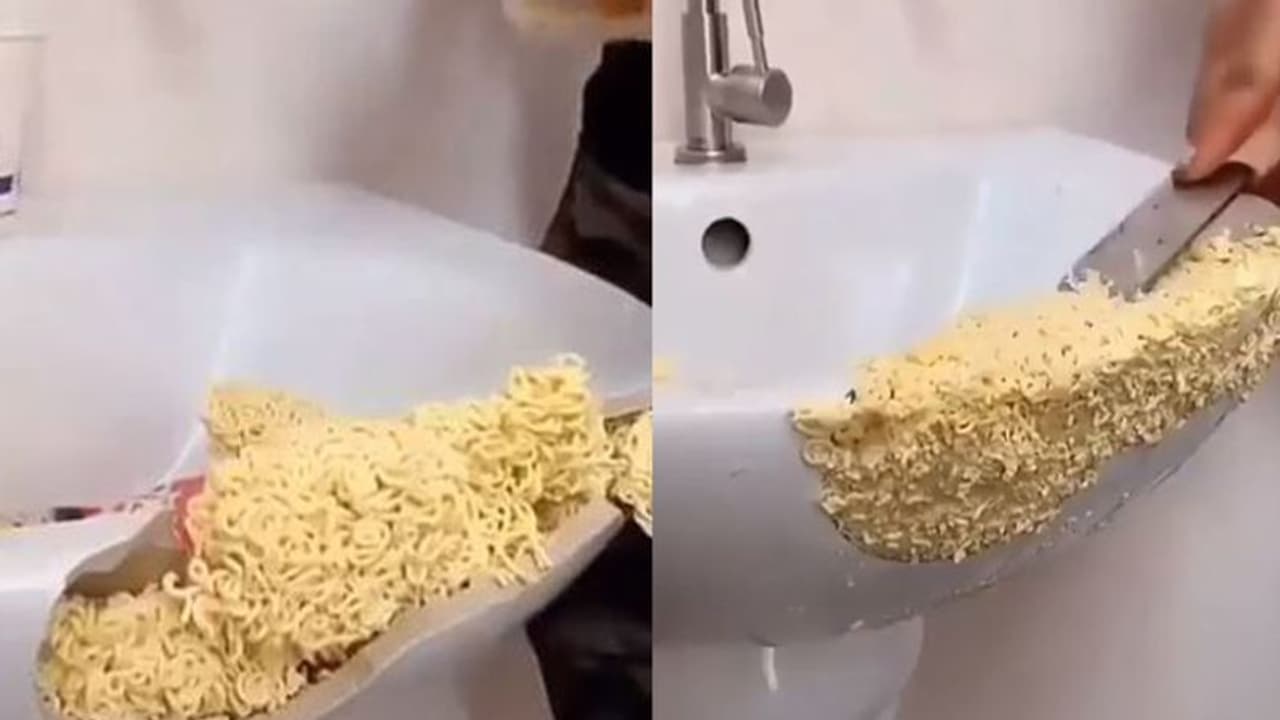 ന്യൂഡിൽസ് കൊണ്ട് വാഷ്ബെയ്സിന്റെ പൊട്ടിയ ഭാഗം അടയ്ക്കുന്ന വീഡിയോയാണ് വെെറലായത്.വാഷ്ബെയ്സിന്റെ പൊട്ടിയ ഭാഗത്തേക്ക് രണ്ടു പായ്ക്കറ്റ് പൊട്ടിച്ച ന്യൂഡിൽസ് വച്ച ശേഷം പശ തേച്ച് ഒട്ടിക്കുന്നു. ശേഷം ന്യൂഡിൽസ് സിമന്റു പോലെ പൊട്ടിയ ഭാഗത്ത് തേച്ച് ഒട്ടിച്ച് വെള്ള സ്പ്രെ പെയിന്റ് ചെയ്ത് ഈ ഭാഗം മറയ്ക്കുന്നു.