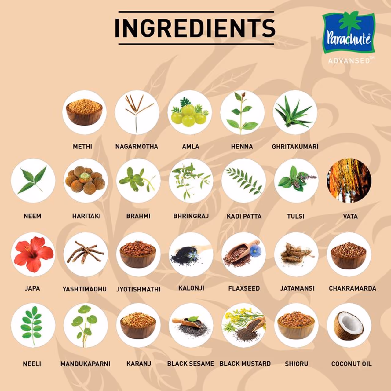ആയൂർവേദം ശരീരവും ജീവിത ഛംക്രമണവും തമ്മിൽ ബന്ധിപ്പിക്കാനുള്ള മികച്ച വഴിയാണ്. പ്രകൃദിതത്തമായ ചേരുവകൾ ആയത് സുരക്ഷിതമായ ദൈനംദിന ഉപയോഗത്തിന് ഏറെ സഹായകമാണ്. കാലാവസ്ഥമാറ്റത്തിനനുസരിച്ച് മുടി പരിചരണം പ്രയാസകരമാണ്. പാരച്യൂട്ട് അഡ്വാൻസ്സ് ഹെയർ ഓയിലിന്റെ സ്ഥിരം ഉപയോഗം വഴി മുടിയിഴകളുടെ സംരക്ഷണവും വളർച്ചയും മാത്രമല്ല, തലയോട്ടിയുടെ ദീർഘകാല പരിപോഷണവും ഉറപ്പുവരുത്താൻ കഴിയും.