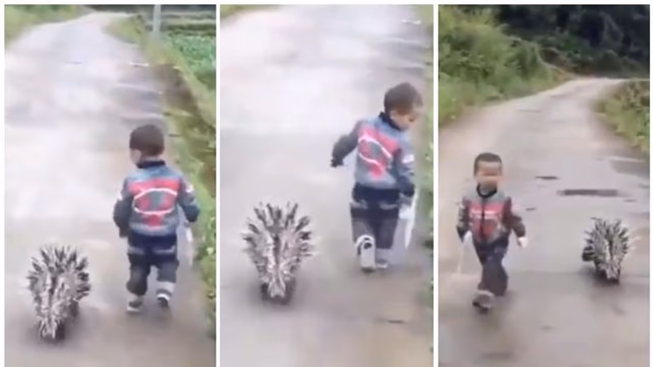 ഒരു കൊച്ചുകുട്ടിയുടെ കൂടെ നടക്കുന്ന മുള്ളൻപന്നിയാണ് ഇപ്പോൾ സോഷ്യൽ മീഡിയയിൽ താരമായിരിക്കുന്നത്. കുട്ടി നടക്കുന്ന താളത്തിനൊപ്പിച്ചാണ് മുള്ളൻപന്നിയും കൂടെ നടക്കുന്നത് എന്നതാണ് ഏറെ രസകരം. കുട്ടി ഓടുമ്പോൾ കൂടെ ഓടുകയും ചെയ്യുന്നുണ്ട്.