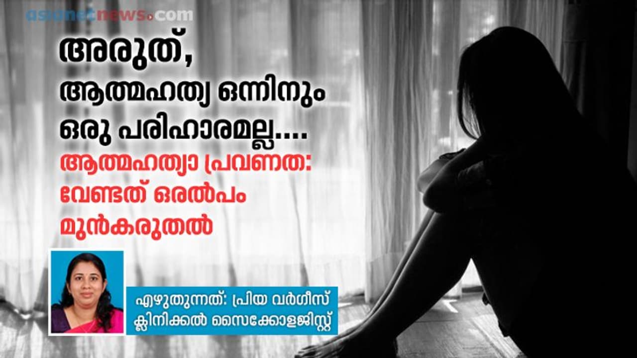 തുറന്നു പറയാന് നമുക്കു ശീലിക്കാം. മരണത്തെക്കുറിച്ച് സംസാരിക്കുന്ന ഒരു വ്യക്തി ആരെങ്കിലും എന്നെയൊന്നു സഹായിക്കൂ എന്ന അപേക്ഷയാണ് യഥാര്ത്ഥത്തില് നടത്തുന്നത്. പലപ്പോഴും എല്ലാമവരും തുറന്നു പറഞ്ഞുവെന്നു വരില്ല. മരിക്കാന് തീരുമാനിച്ചശേഷം അതുവരെ നിധിപോലെ കാത്തു സൂക്ഷിച്ചിരുന്ന വസ്തുക്കള് ആര്ക്കെങ്കിലും കൈമാറാം, ഫേസ്ബുക്കില് മരണവുമായി ബന്ധപ്പെട്ട പോസ്റ്റുകളിടാം, വലിയ കുറ്റബോധം തോന്നുന്നു എന്നു പറഞ്ഞെന്നു വരാം, അപകടകരമായ പ്രവര്ത്തികളില് ഏര്പ്പെടാം. ഇങ്ങനെ എന്തെങ്കിലും ലക്ഷണങ്ങള് നമ്മുടെ സുഹൃത്തുക്കളിലോ കുടുംബാങ്ങളിലോ ഉള്ളതായി ശ്രദ്ധയില്പെട്ടാല് നമുക്കതു ഗൗരവമായി എടുക്കാം.