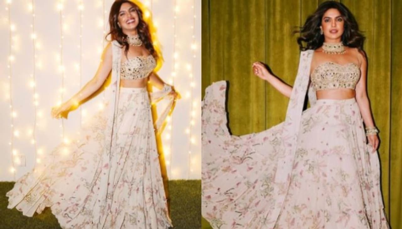 ഗോള്ഡന്- ഓഫ് വൈറ്റ് നിറത്തിലുള്ള മനോഹരമായ ലെഹങ്കയും ചോളിയും ധരിച്ചുള്ള ചിത്രമാണ് പ്രിയങ്ക പങ്കുവച്ചത്. അർപ്പിത മേത്ത ആണ് ഈ ഫ്ലോറൽ പ്രിന്റ് ചെയ്ത ലെഹങ്ക ഡിസൈന് ചെയ്തത്.