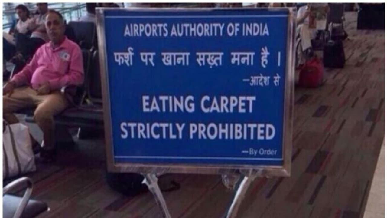 ബോര്ഡില് ഇംഗ്ലീഷില് എഴുതിയിരിക്കുന്നതിന്റെ അര്ത്ഥം ഇതാണ്- '' പരവതാനി കഴിക്കുന്നത് കര്ശനമായി നിരോധിച്ചിരിക്കുന്നു''. എയര്പോര്ട്ട് അഥോറിറ്റി ഓഫ് ഇന്ത്യയാണ് ഈ ബോര്ഡ് സ്ഥാപിച്ചിരിക്കുന്നത്. ''ശരിക്കും ?'' എന്ന ഒറ്റവാക്കോടെയാണ് നടിയും സാമൂഹ്യപ്രവര്ത്തകയുമായ ഷബാന ആസ്മി ചിത്രം ട്വീറ്റ് ചെയ്തത്.