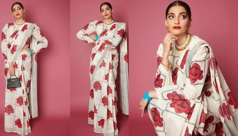 'ദ് സോയ ഫാക്ടർ’ എന്ന സിനിമയുടെ പ്രമോഷൻ ചടങ്ങിനിടെയാണ് സോനം ഈ സാരി ധരിച്ചത്. വലിയ പ്രിന്റുകളുള്ള ഓഫ് വൈറ്റ് സാരി.