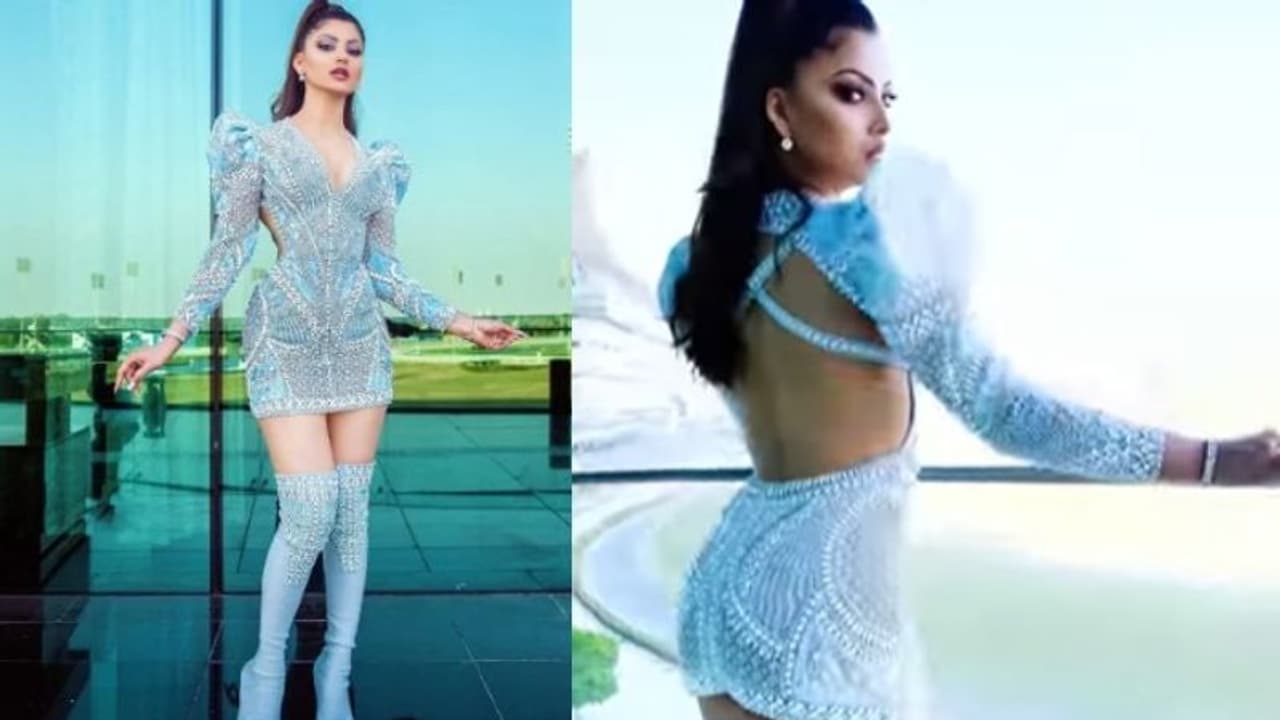 സിൽവർ ക്രിസ്റ്റലുകളാല് മനോഹരമായ ഡ്രസ്സാണ് ഉർവശി ധരിച്ചിരിക്കുന്നത്. സ്വരോസ്കി ക്രിസ്റ്റലുകൾ ആണ് വസ്ത്രം ഡിസൈന് ചെയ്യാന് ഉപയോഗിച്ചത്. നീല നിറത്തിലുള്ള ബോഡികോണ് വസ്ത്രത്തില് പഫി സ്ലീവാണ് വരുന്നത്. വസ്ത്രത്തിന് അനുയോജ്യമായ ക്രിസ്റ്റൽ സ്റ്റഡുകളോടു കൂടിയ ചെരിപ്പുകളുമാണ് ഉർവശി ധരിച്ചിരിക്കുന്നത്.