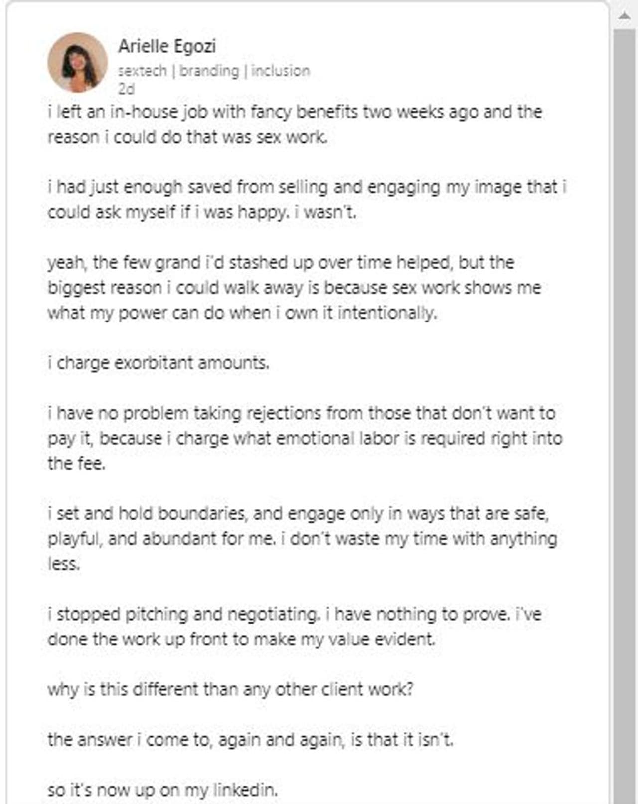 ഇപ്പോഴും സെക്സ് വർക്ക് തന്നെയാണ് ചെയ്യുന്നതെന്നും എഗോസി ലിങ്ക്ഡ്ഇൻ പ്രൊഫൈലിൽ സൂചിപ്പിച്ചിട്ടുണ്ട്. രണ്ടാഴ്ച്ചയ്ക്ക് മുമ്പ് ഒരു വീട്ടിൽ ക്ലീനിംഗിന് ജോലിയ്ക്ക് പോയിരുന്നു. എന്നാൽ ആ ജോലി ഉപേക്ഷിച്ചു. കാരണം ലെെംഗിക തൊഴിൽ ഉള്ളതിനാൽ ആ ജോലി ഉപേക്ഷിക്കേണ്ടി വന്നുവെന്നും എഗോസി പറഞ്ഞു. ലെെംഗിക തൊഴിൽ ഏറെ താൽപര്യത്തോടെയാണ് ചെയ്യുന്നതെന്നും അവർ പറഞ്ഞു.
