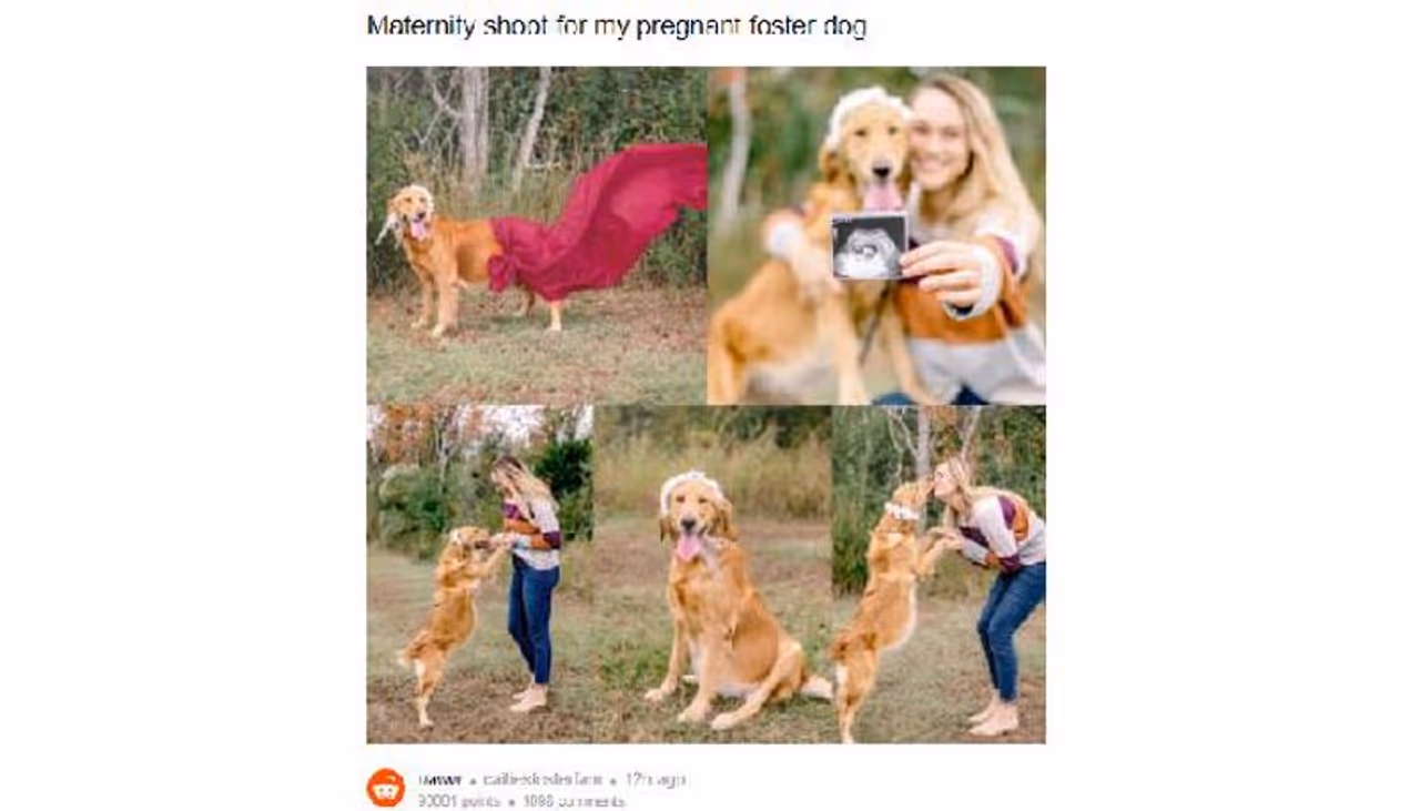 ഗര്ഭിണിയായ വളര്ത്തുനായയുടെ മെറ്റേണിറ്റി ഫോട്ടോഷൂട്ടിന്റെ രസകരമായ ചിത്രങ്ങളാണ് യുവതി റെഡ്ഡിറ്റിലൂടെ പങ്കുവച്ചത്.