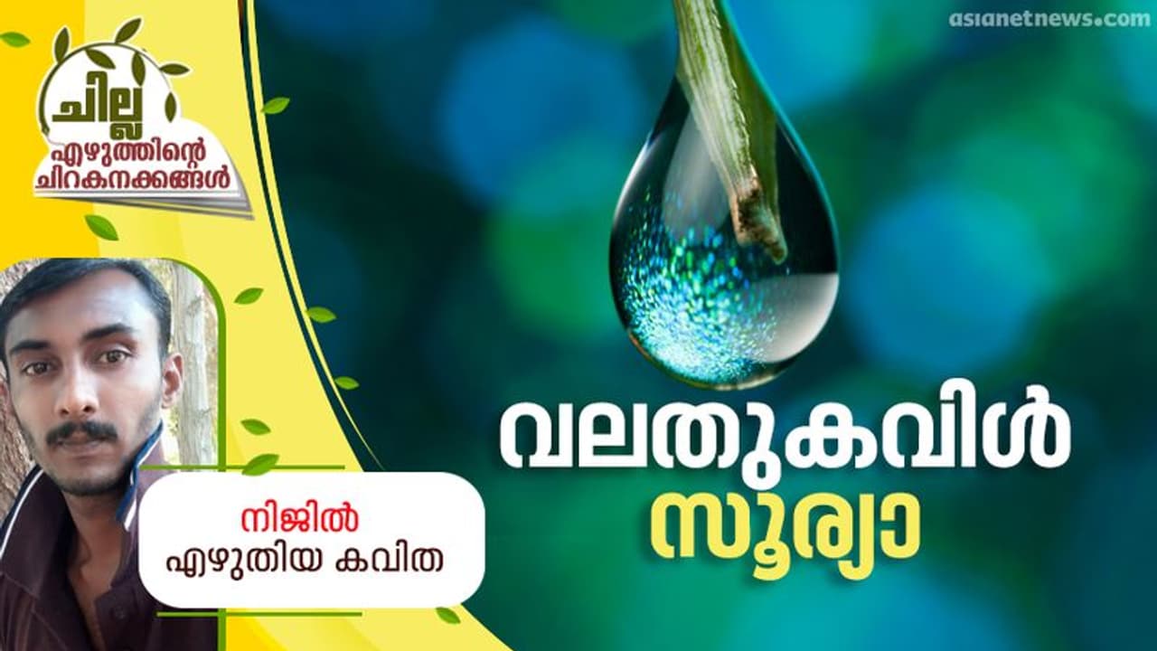 ചില്ല. മികച്ച എഴുത്തുകള്ക്ക് ഒരിടം. സൃഷ്ടികള് submissions@asianetnews.in എന്ന വിലാസത്തില് അയക്കൂ. ഒപ്പം ഫോട്ടോയും വിശദമായ വിലാസവും അയക്കണം. എഡിറ്റോറിയല് ബോര്ഡ് തെരഞ്ഞെടുക്കുന്ന സൃഷ്ടികള് പ്രസിദ്ധീകരിക്കും