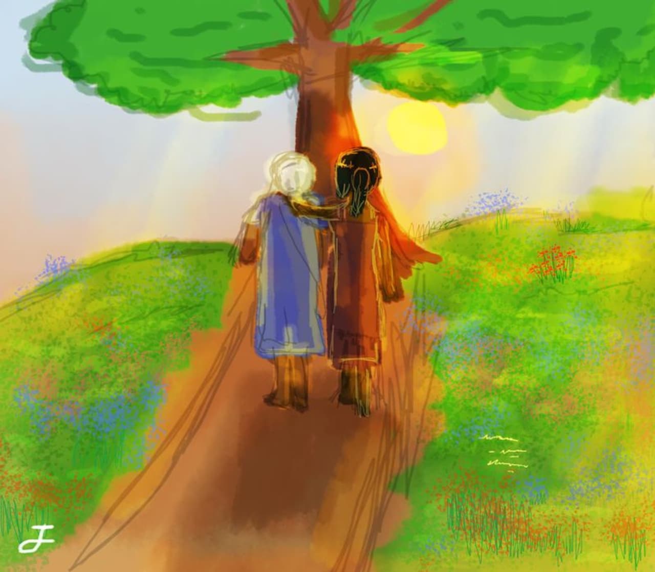 നടന്നുനടന്ന് അവര് ആ വലിയ വൃക്ഷത്തിന്റെ തറയിലെത്തി. അപ്പോള് ചെറുതായി കാറ്റുവീശി. പൂക്കളുടെ മണമുള്ള ഇളം കാറ്റില് മുത്തശ്ശി ഇരുന്നു.