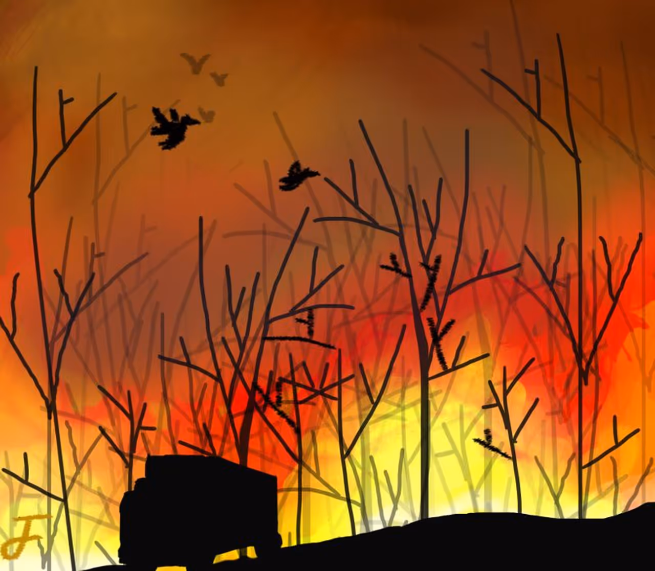 കാട് ദിവസങ്ങളോളം നിന്നു കത്തി. തീയണഞ്ഞപ്പോള് കാടിരുന്നിടത്ത് വലിയൊരു ചാരക്കൂന മാത്രം ബാക്കിയായി. അവിടെ ഒരു കാടുണ്ടായിരുന്നു എന്നാരും പറയാത്ത വിധം വെറും ചാരം.