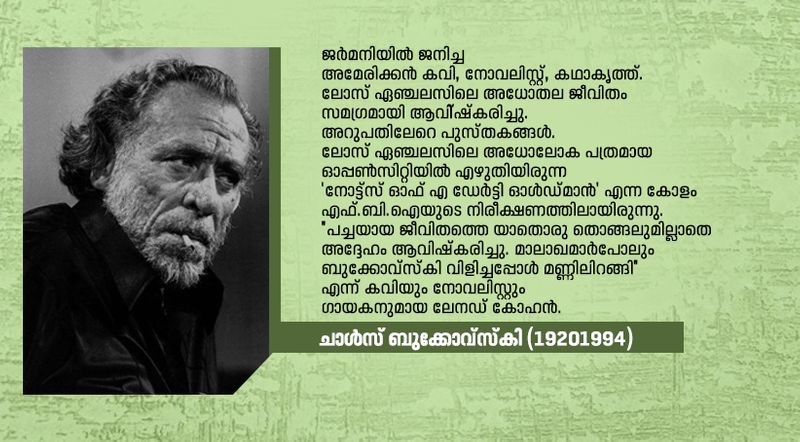 വാക്കുല്സവത്തില് ഇന്ന് ചാള്സ് ബുക്കോവ്സ്കി എഴുതിയ രണ്ട് കവിതകള്. വിവര്ത്തനം. ഡോ. ടി വി സജീവ്