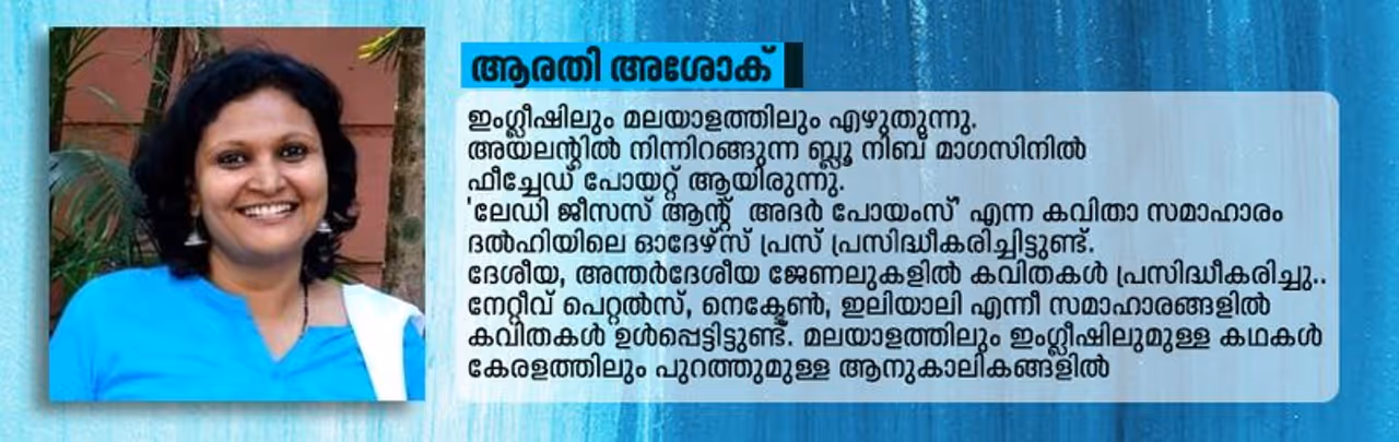 രണ്ടു ഭാഷകള്. കവിത, കഥ എന്നിങ്ങനെ രണ്ടു മാധ്യമങ്ങള്. എഴുത്തുകാരി എന്ന നിലയില് ആരതി അശോകിന്റെ ലോകങ്ങള് ഇവയാണ്. ഇംഗ്ലീഷില് കവിതയും കഥയും എഴുതുന്നു. ദേശീയ അന്തര് ദേശീയ മാധ്യമങ്ങളില് അവ പ്രസിദ്ധീകരിക്കുന്നു. ആ തലങ്ങളില് ചര്ച്ച ചെയ്യപ്പെടുന്നു. പ്രമേയ തലത്തിലും ആഖ്യാനത്തിലും വ്യത്യസ്തമായ ഇടങ്ങള് തിരയുന്നു, സൃഷ്ടിക്കുന്നു. എന്നാല്, മലയാളത്തിലെഴുതുമ്പോള്, നിരന്തരം പെരുമാറാത്തതിനാലാവാം, ഭാഷയുടെ വീട്ടുവഴക്കങ്ങള് ആഖ്യാനത്തിന്റെ ഒഴുക്കിനെ ഇഴ മുറിക്കുന്നു. വ്യത്യസ്തമായ രാഷ്ട്രീയ, സാമൂഹ്യ സാഹചര്യങ്ങളെ അടയാളപ്പെടുത്തുന്നുന്നുവെങ്കിലും, അവ പലപ്പോഴും മാധവിക്കുട്ടിയുടെ എഴുത്തുകളെ, ഭാഷയുടെ തലത്തില് ഓര്മ്മിപ്പിക്കുന്നു. എന്നാല്, ഉള്ളടക്കത്തിലെ രാഷ്ട്രീയ വീക്ഷണവും ജീവിക്കുന്ന കാലത്തോടും ദേശത്തോടുമുള്ള നിലപാടുകളും സമകാലികതയും മാധവിക്കുട്ടിയുടെ എഴുത്തുകളോടുള്ള ചാര്ച്ചകളെ സ്വയം നിഷേധിക്കുന്നു, അത്തരമൊരു താരതമ്യവഴിയെ കബളിപ്പിച്ച് എഴുത്തിന്റെ കരുത്തുകൊണ്ട് മുന്നോട്ടേക്ക് നടക്കുന്നു.
